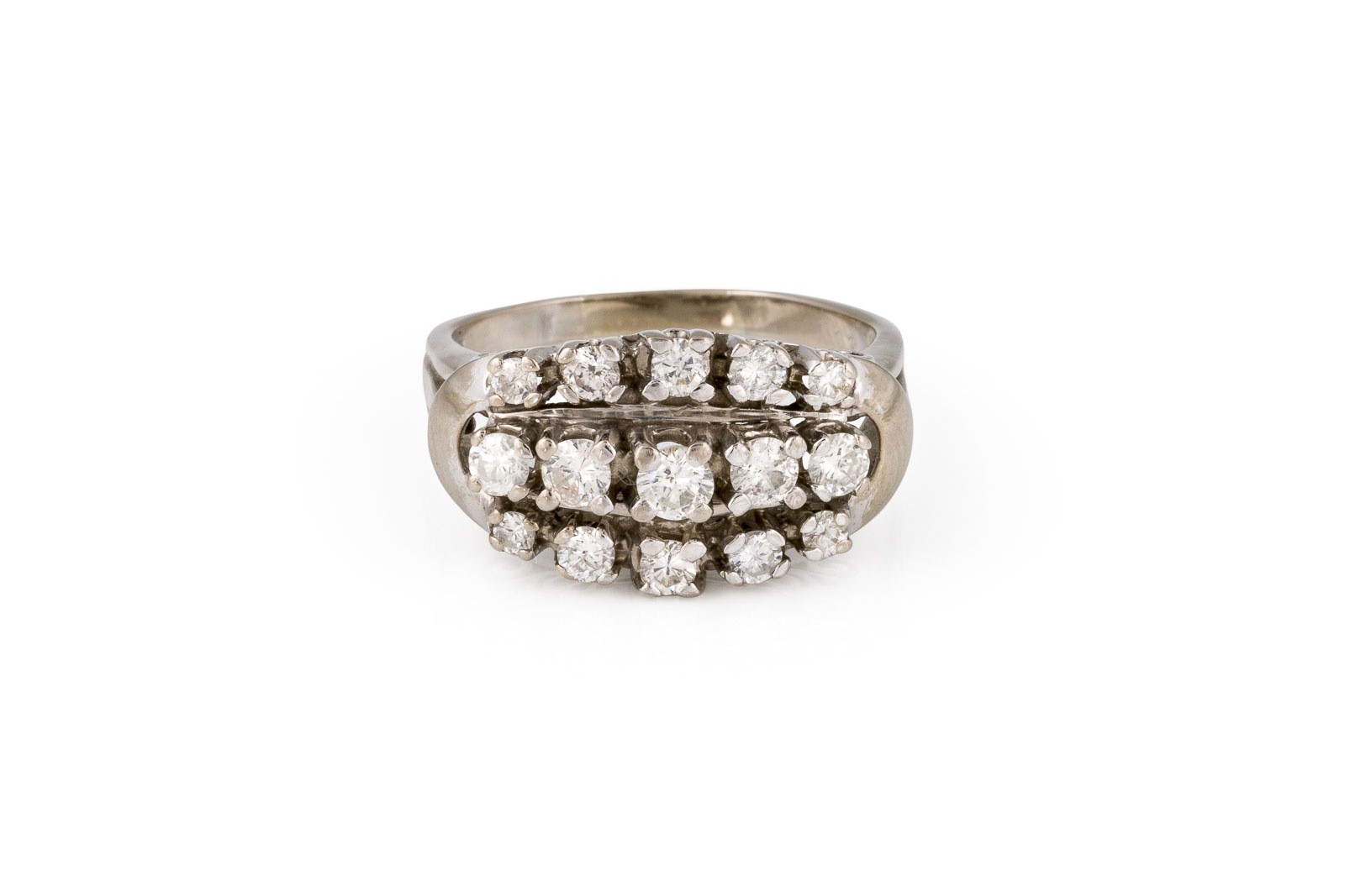 WG 585. Ringmaß: ca. 59. Ringkopfmaße: ca. 17,5 x 11,8 mm. Ges.-Gew.: ca. 6,2 g. Ring, besetzt mit Brillanten zus. ca. 1.13 ct. G-H/VS-P.