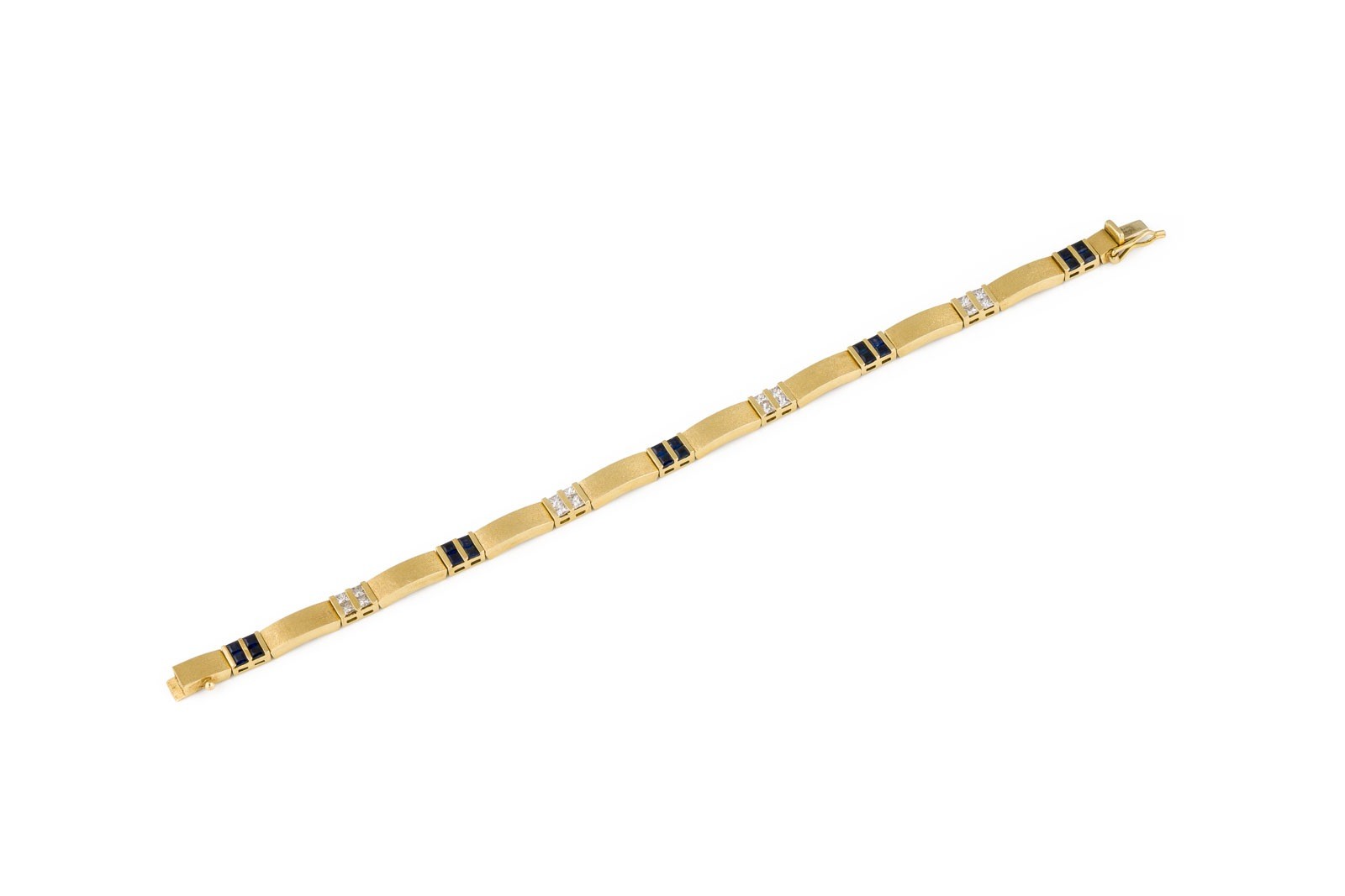 GG 750. Maße: L.: ca. 18,0 cm. B.: ca. 5,0 mm. Ges.-Gew.: ca. 20,1 g. Armband, besetzt mit Saphiren zus. ca. 1.20 ct., sowie Brillanten zus. ca. 0.69 ct.