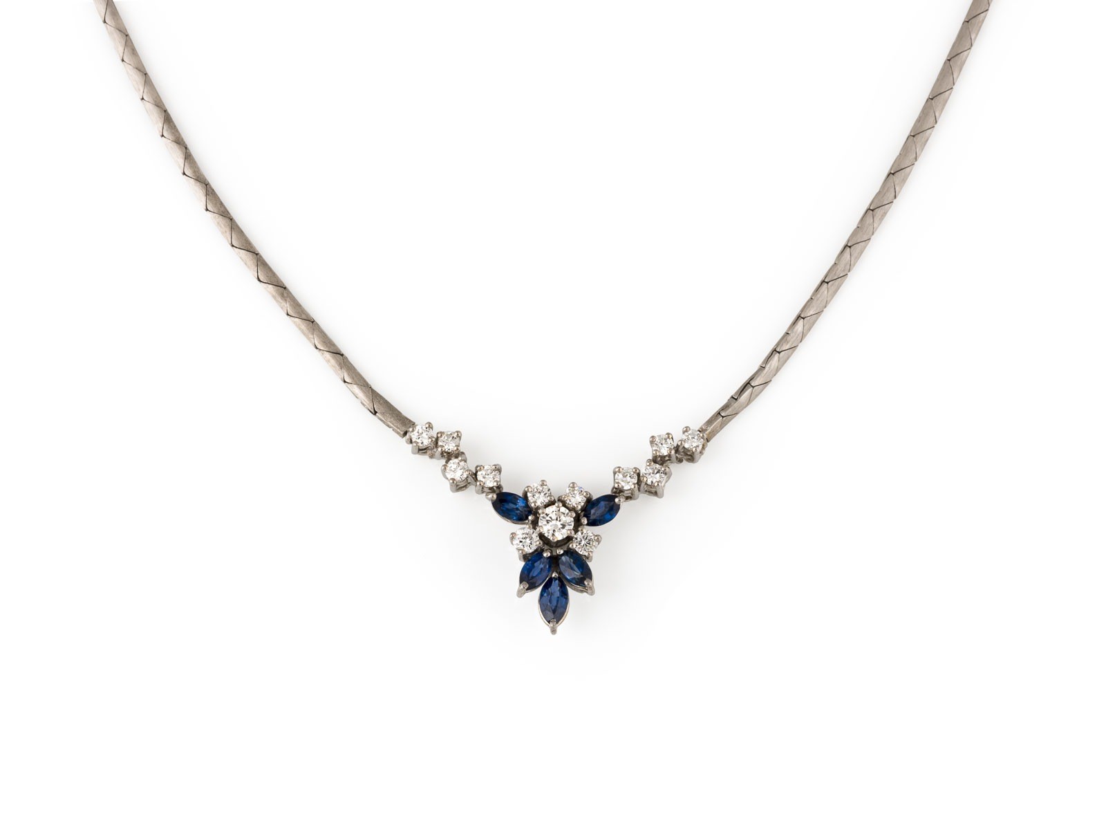 WG 585. L.: ca. 41,0 cm. Ges.-Gew.: ca. 14, 3 g. Collier, besetzt mit 5 Saphiren im Navetteschliff zus. ca. 0.50 ct., sowie 13 Brillanten