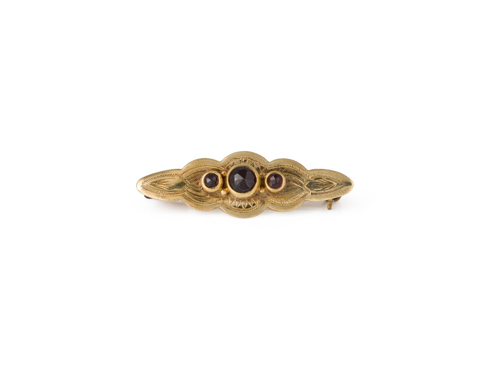 GG 585. Maße: ca. 35,8 mm x 11,4 mm. Ges.-Gew.: ca. 3,0 g. Brosche, besetzt mit 3 kleinen roten Farbsteinen - wohl Granate.