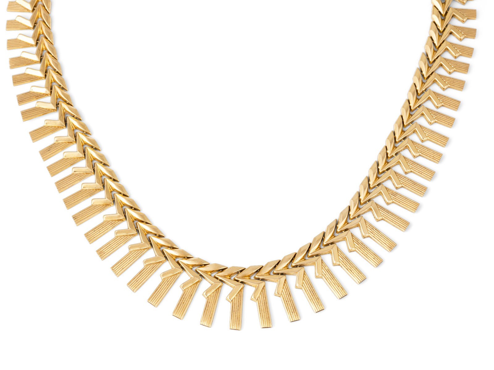 GG 750. Maße: L.: ca. 46,0 cm, B.: ca. 20,9 mm. Ges.-Gew.: ca. 37,9 g. Collier im Kleopatra-Stil. Steckverschluss mit Sicherheitsschloss.