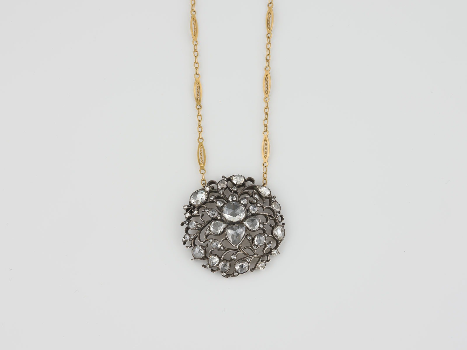 Gelbgold, Silber. L. 44,5 cm, Ges.-Gew. ca. 11,4 g. Kette geprüft 14 K, Schaustück Silber, part. vergoldet. Diamantrosenbesatz, zusammen ca. 4,50 ct.