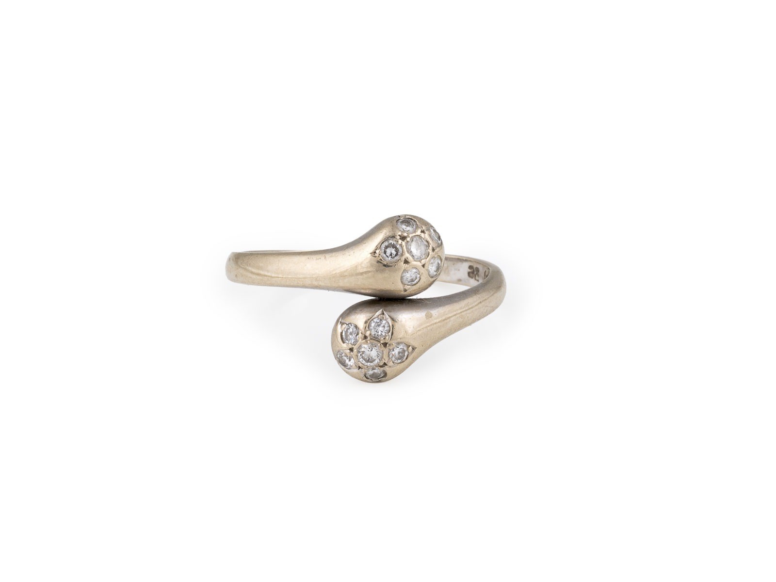 WG 585. Ringmaß: ca. 57. Ringbreite: ca. 13,0 mm. Ges.-Gew.: ca. 3,7 g. Contrarié Ring, besetzt mit Diamanten zus. ca. 0.20 ct.
