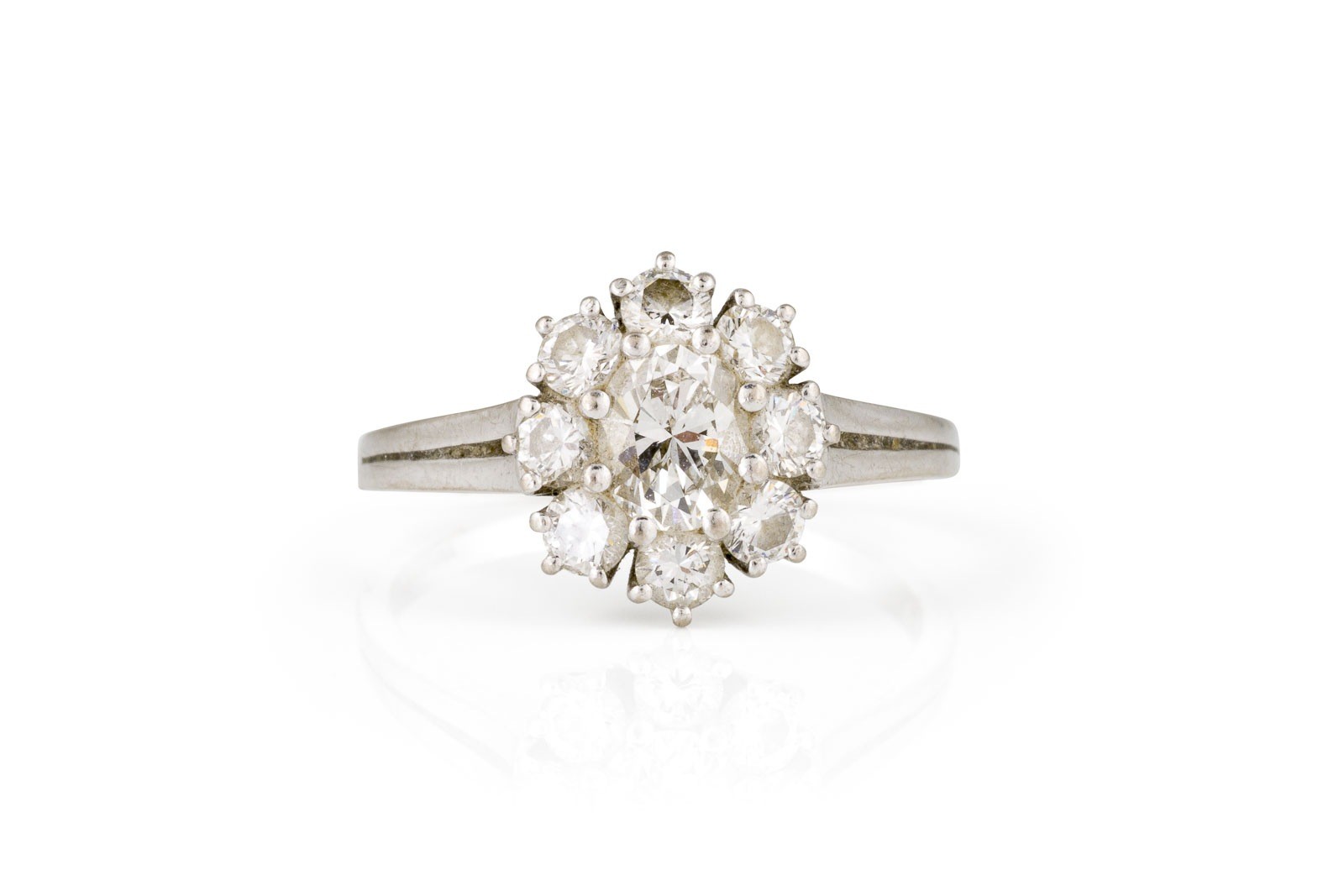 WG 750. Ringmaß: ca. 56. Ringkopfmaße: ca. 12,2 x 11,0 mm. Ges.-Gew.: ca. 3,9 g. Ring, besetzt mit einem zentralen, ovalen Diamanten und einem Kranz aus Brillanten zus.