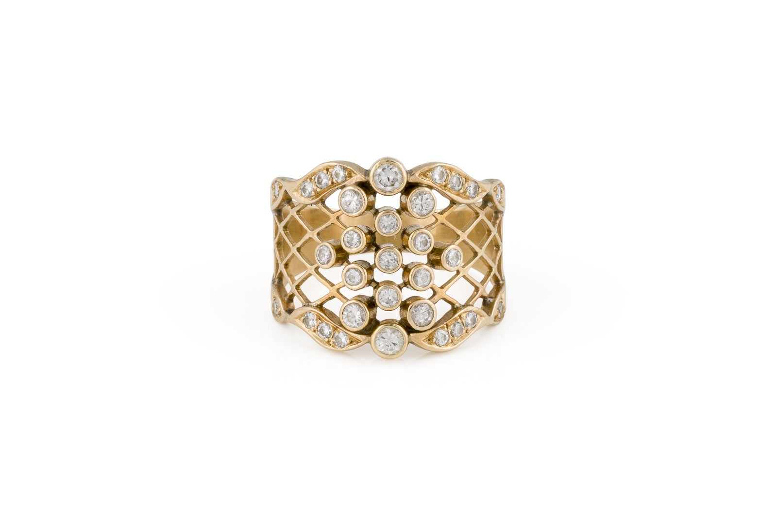 GG 750. Ringmaß: ca. 55,5. Ringbreite: ca. 16,6 mm. Ges.-Gew.: ca. 5,5 g. Designring, besetzt mit Brillanten zus. ca. 0.64 ct. H/VVS-P.