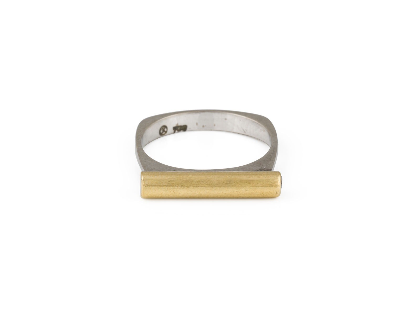 WG/GG 750. Ringmaß: ca. 53,5. Ringkopfmaße: ca. 18,1 x 3,4 mm. Ges.-Gew.: ca. 4,3 g. Design-Stab-Ring, besetzt mit einem seitlich angebrachten Brillanten von ca. 0.10 ct.
