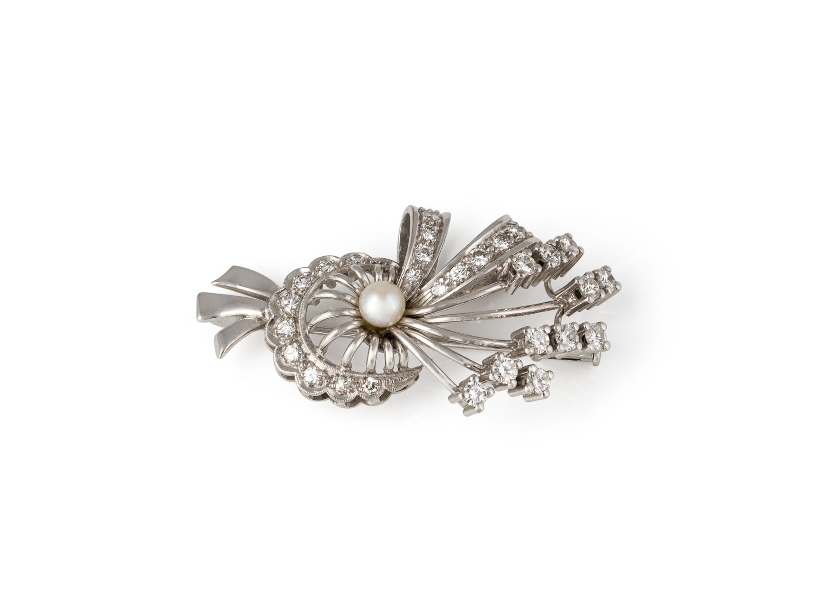 WG 585. Maße: ca. 49,3 mm x 26,3 mm. Ges.-Gew.: ca. 14,4 g. Brosche, besetzt mit ca. 1.50 ct. Diamanten H/VS-P, sowie einer Perle. D.(Perle): ca. 5,4