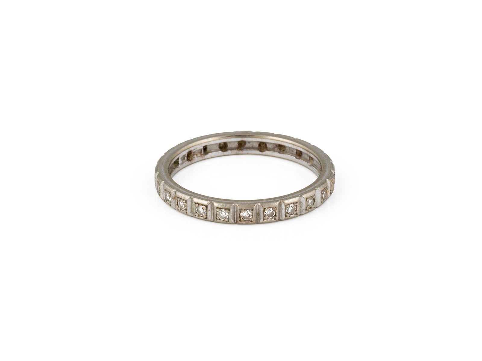 WG 750. Ringmaß: ca. 58,5. Ringbreite: ca. 2,8 mm. Ges.-Gew.: ca. 3,6 g. Memoirering, besetzt mit Diamanten im 8/8-Schliff zus. ca. 0.24 ct.