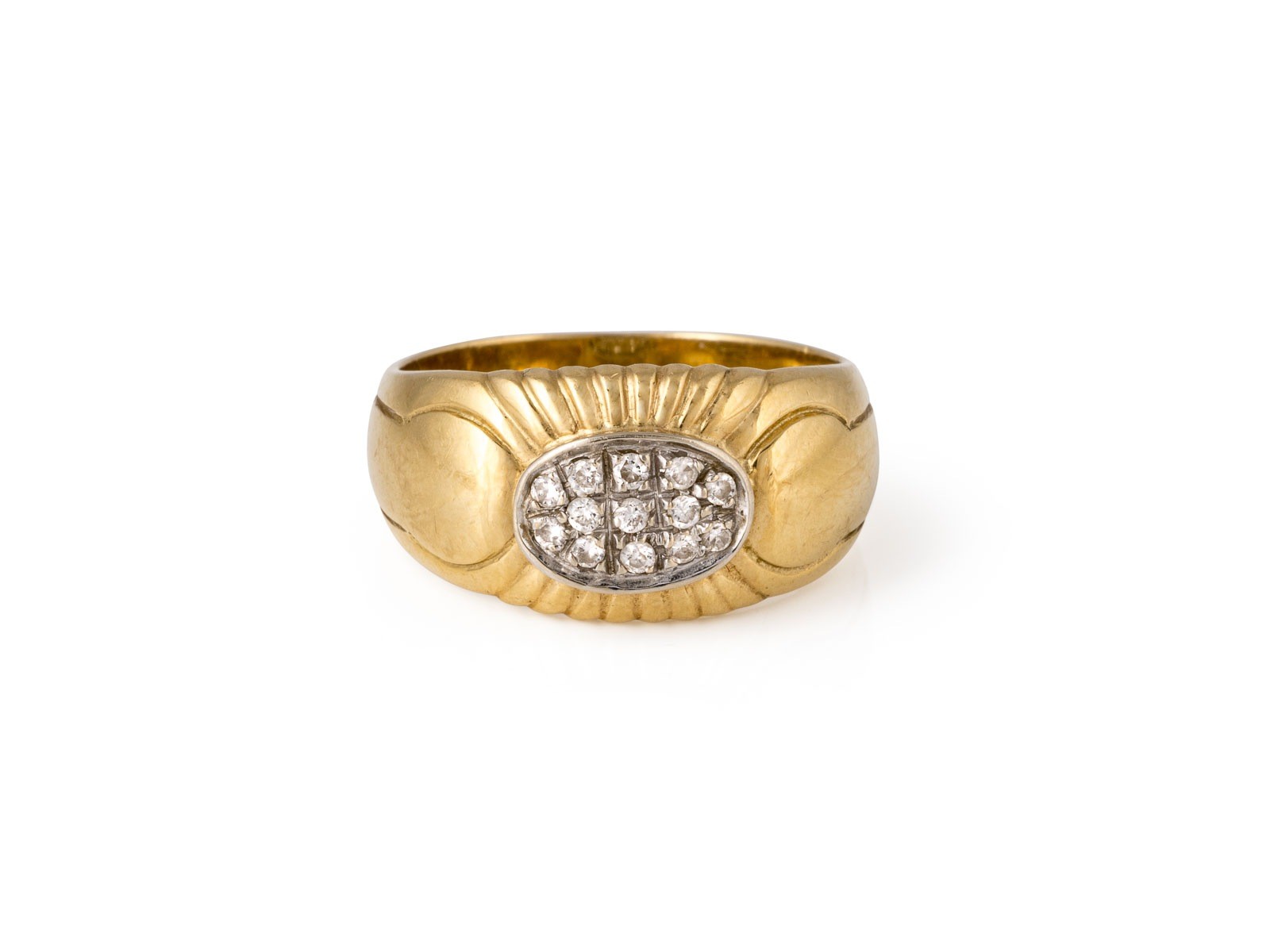 GG 750 (getestet). Ringmaß: ca. 55. Ringbreite: ca. 10,1 mm. Ges.-Gew.: ca. 6,0 g. Ring, besetzt mit Diamanten in Pavéfassung zus. ca. 0.07 ct.