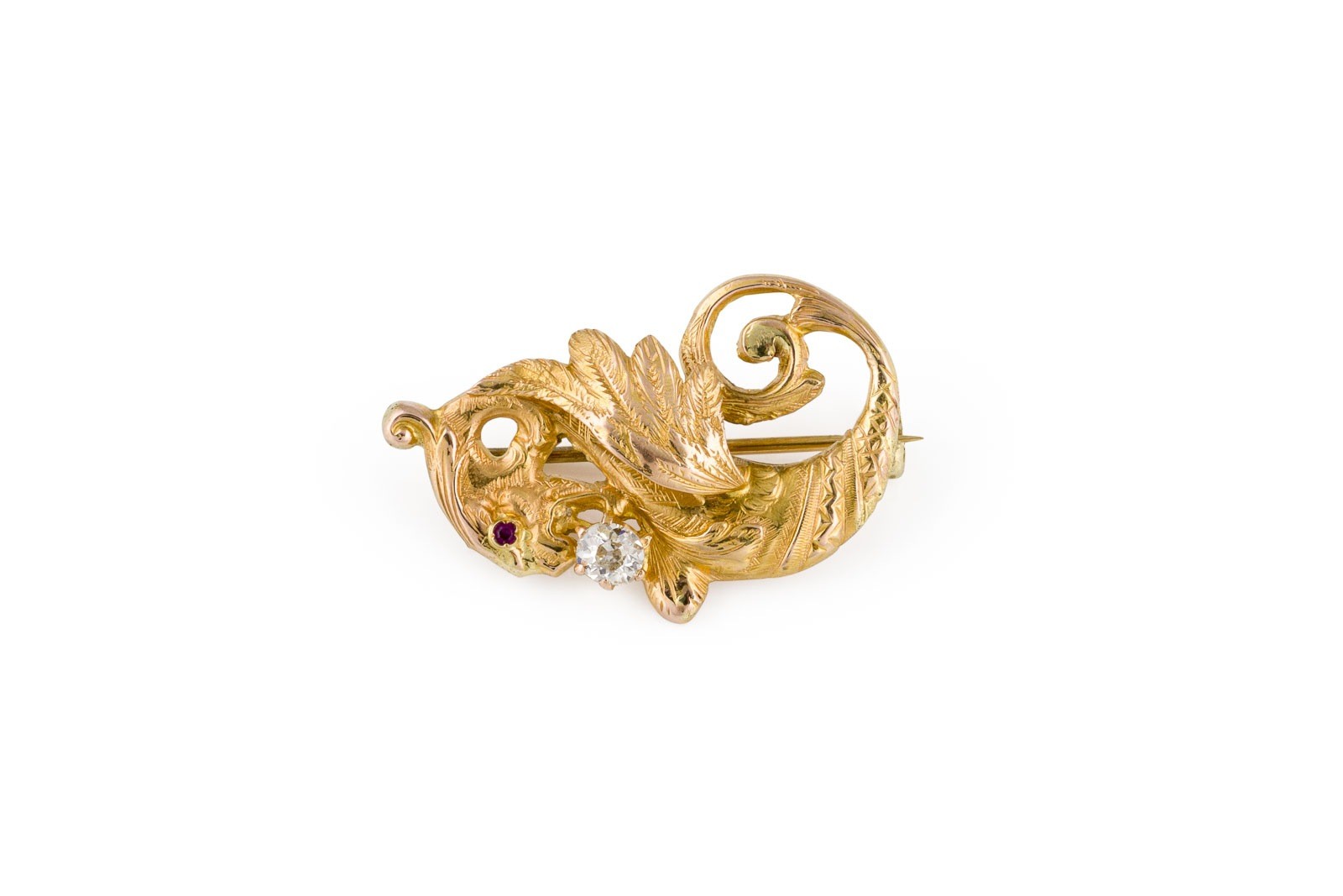 GG 585. Maße: ca. 28,2 x 7,0 mm. Ges.-Gew.: ca. 2,9 g. Brosche in Form eines Drachens, besetzt mit einem Diamanten im Altschliff von ca. 0.25 ct.
