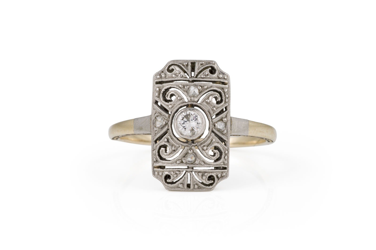 PT/GG 585. Ringmaß: ca. 55. Ringkopfmaße: ca. 15,4 x 9,3 mm. Ges.-Gew.: ca. 2,7 g. Ring, besetzt mit einem zentralen Brillanten von ca. 0.10 ct G/P, sowie Rosendiamanten als
