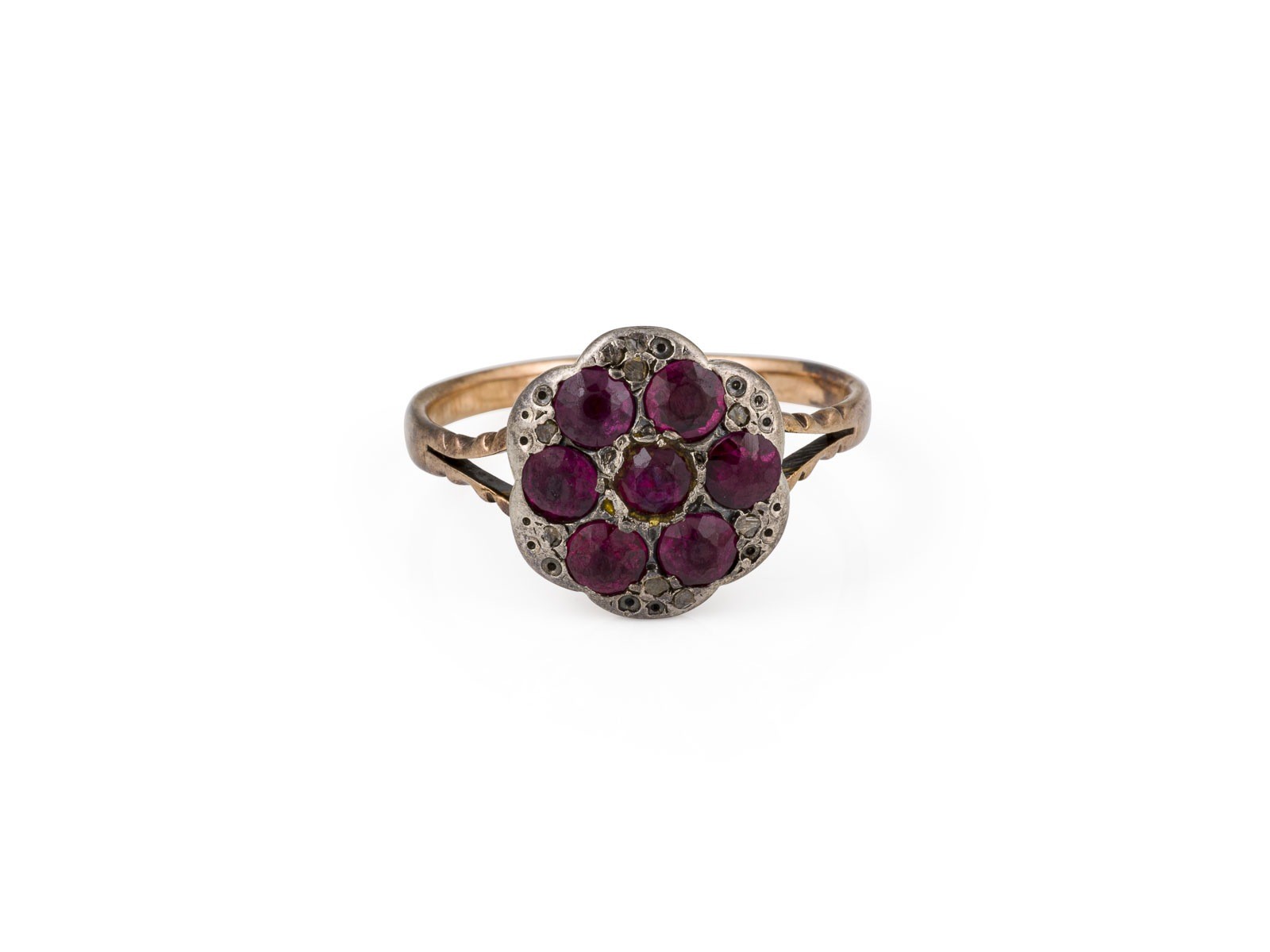 AG/RG 333 (getestet). Ringmaß: ca. 57. D. (Ringkopf): ca. 12,8 mm. Ges.-Gew.: ca. 2,3 g. Ring, mit blumenförmigen Ringkopf, besetzt mit wohl Rubinen zus. ca. 0.75 ct. und kleinen