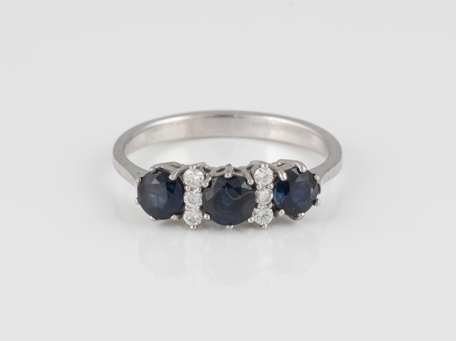 Weißgold. Ringmaß ca. 55,5, Ges.-Gew. ca. 2,6 g. Gest. 585. Drei rund facettierte Saphire, zusammen ca. 1,34 ct., sechs Brillanten, zusammen ca. 0,13