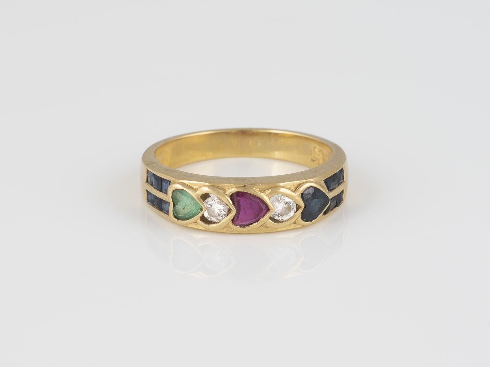 Gelbgold. Ringmaß ca. 53, Ges.-Gew. ca. 4,1 g. Gest. 18 K. Saphire, ein Rubin, ein Smaragd, zwei Brillanten, zusammen ca. 0,10 ct. Part leicht besch.