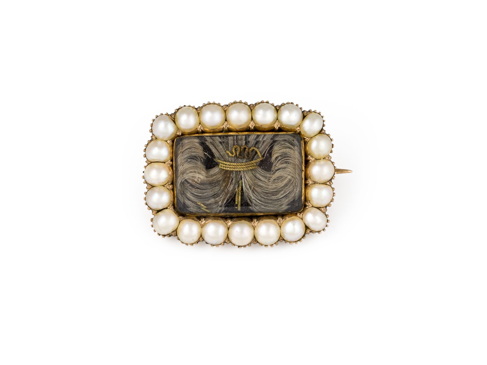 GG 333 (getestet). Maße: ca. 16,2 x 21,3 mm. Ges.-Gew.: ca. 3,7 g. Trauerschmuck-Brosche mit Echthaar-Einlage und einem Kranz aus Perlen.