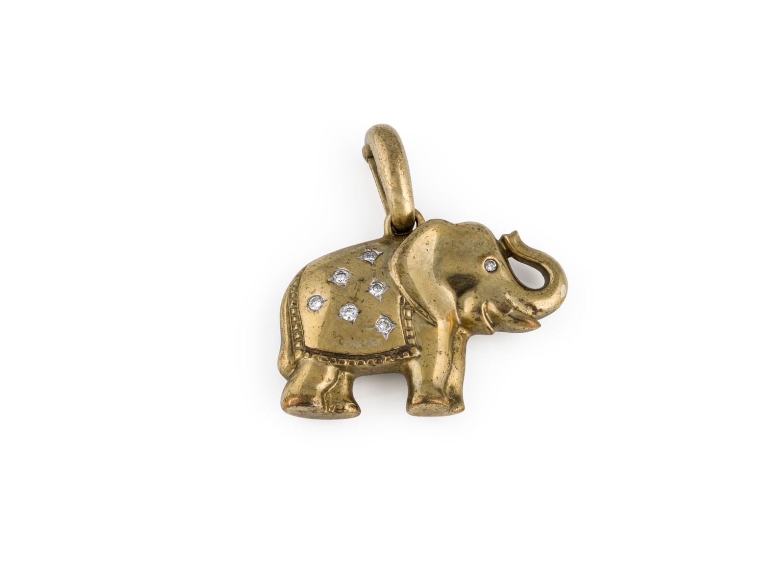GG 333 (getestet). Maße: ca. 26,5 x 28,0 mm. Ges.-Gew.: ca. 6,4 g. Anhänger in Form eines Elefanten, besetzt mit Diamanten zus. ca. 0.10 ct.