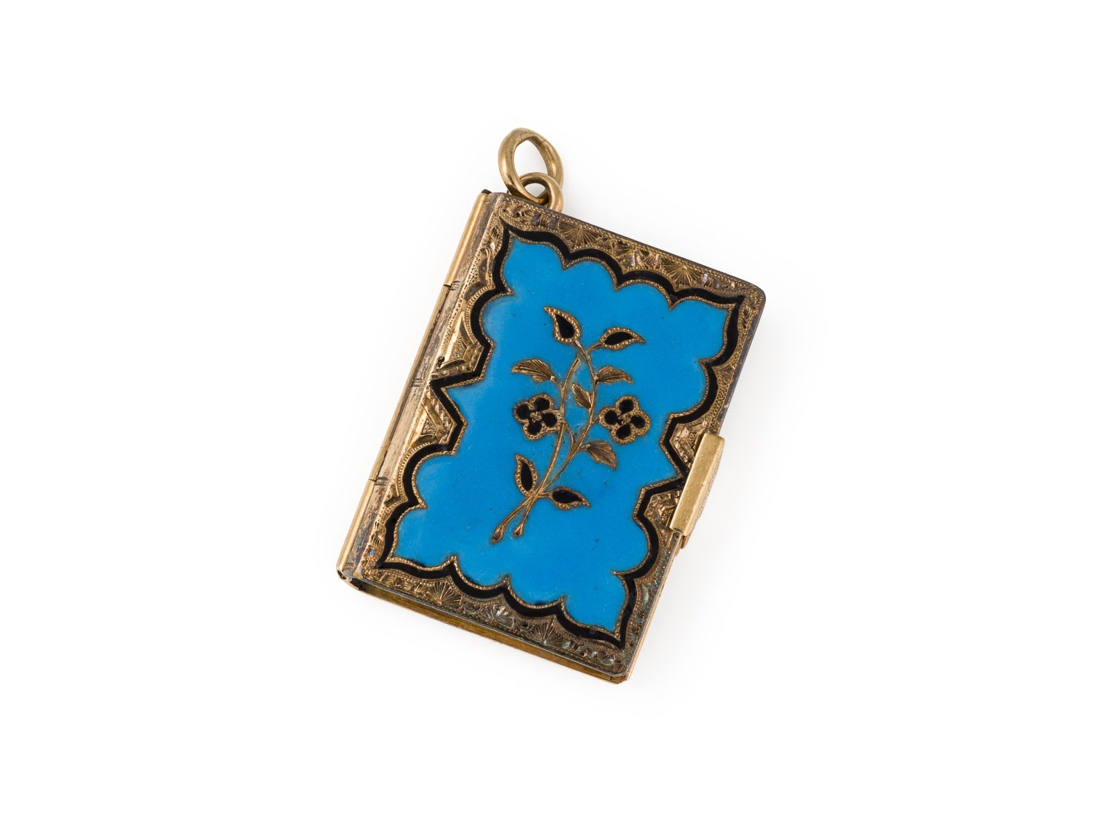 GG 585 (getestet). Maße: ca. 27,1 x 19,7 mm. Ges.-Gew.: ca. 7,8 g. Emailliertes Medaillon zum öffnen in Form eines Buches. Emaille min mer. Min best.