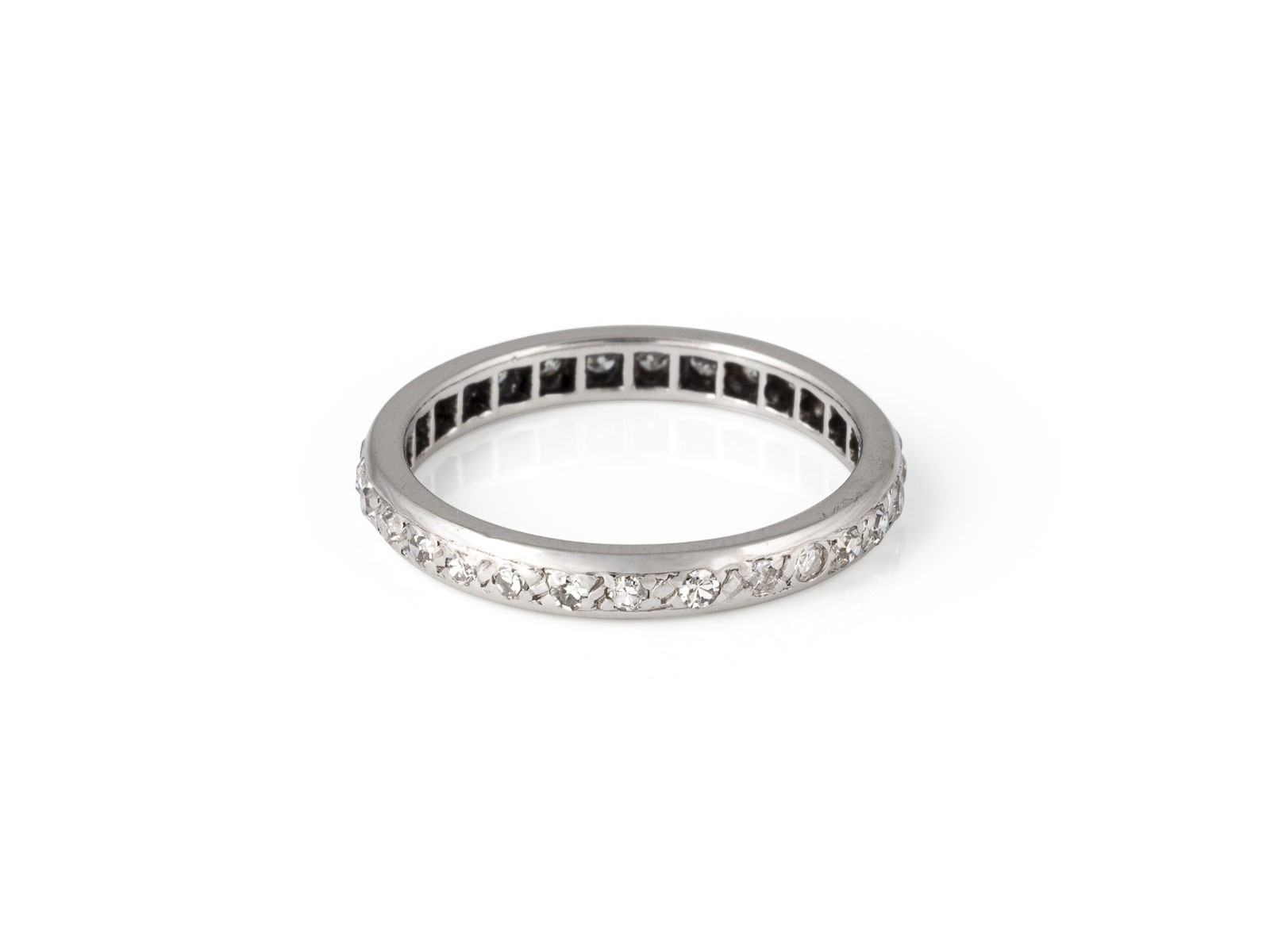 WG 750. Ringmaß: ca. 56. Ringbreite: ca. 3,0 mm. Ges.-Gew.: ca. 3,4 g. Eternity Ring, besetzt mit Diamanten im 8/8-Schliff zus. ca. 0.56 ct.