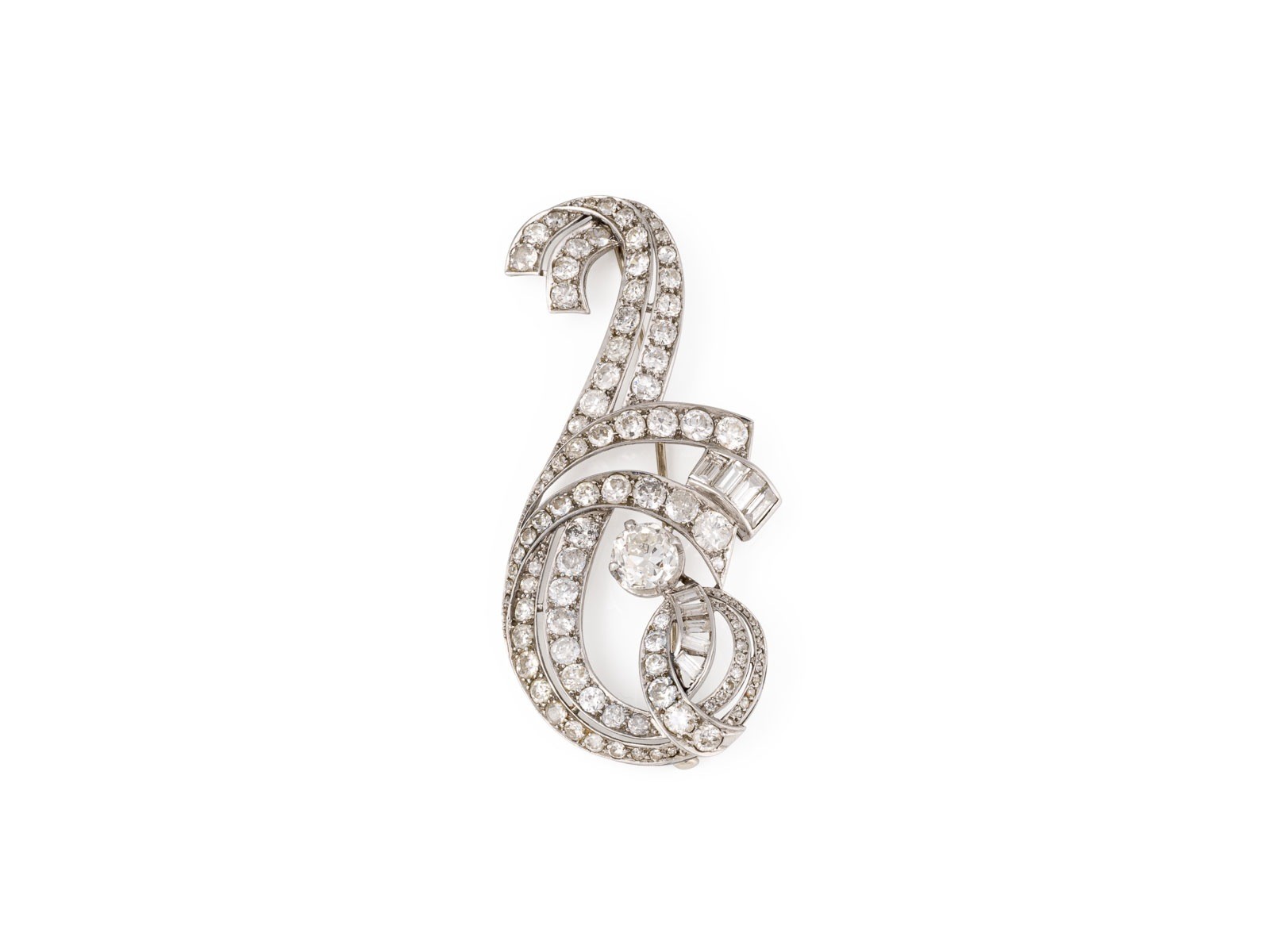 PT (getestet). Maße: ca. 69,0 x 33,0 mm. Ges.-Gew.: ca. 17,8 g. Fantastische Brosche in Form eines Notenschlüssels mit üppigem Diamantbesatz von zus. ca.