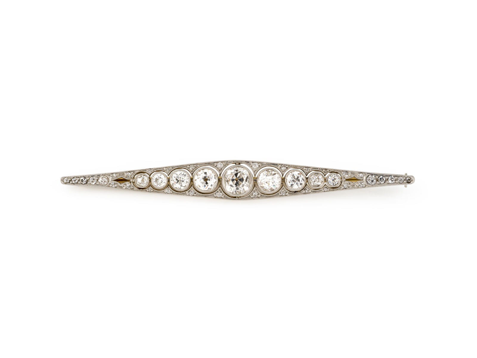 PT/GG 585. Maße: ca. 71,7 x 8,3 mm. Ges.-Gew.: ca. 6,8 g. Stabbrosche, besetzt mit Diamanten im Alt- und 8/8-Schliff zus. ca. 2.30 ct. VS-P.