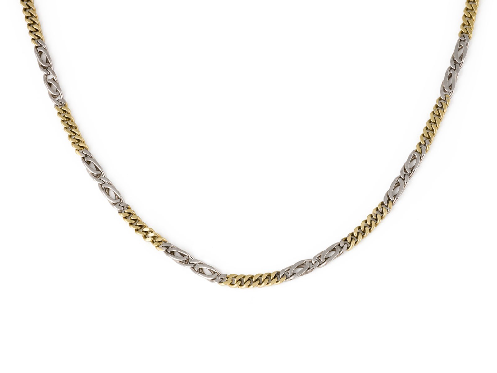 WG/GG 585. Maße: L.: ca. 48 cm. B.: ca. 3,8 mm. Ges.-Gew.: ca. 19,5 g. Collier in Bicolor. Jeweils Figaro- und Panzerkette im Wechsel. Karabinerverschluss.
