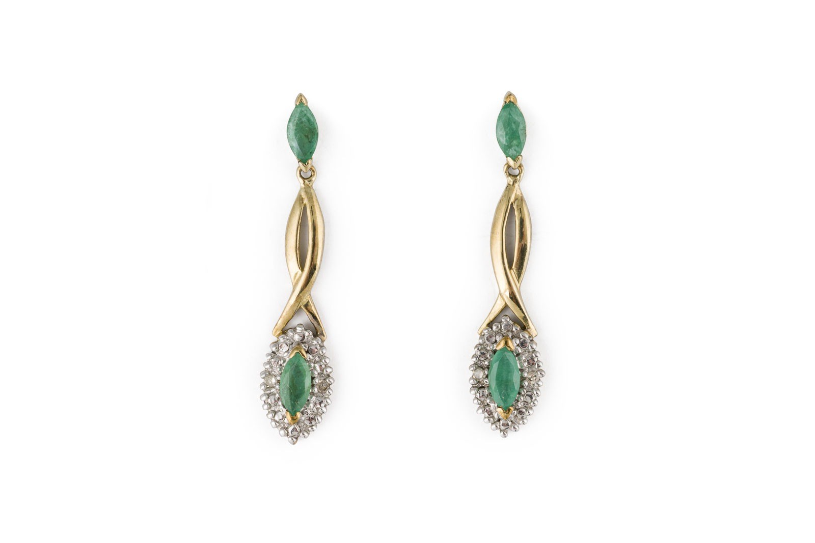 WG/GG 333. L.: ca. 32,4 mm. B.: ca. 7,1 mm. Ges.-Gew.: ca. 2,2 g. Ohrhänger, besetzt mit Smaragden zus. ca. 0.60 ct.