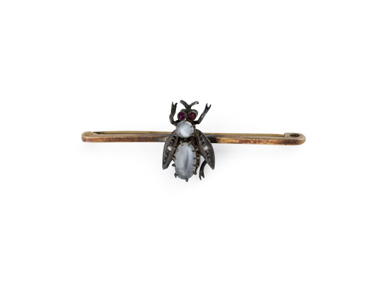 AG/GG 333. Maße: L.: ca. 50,3 mm. B.: ca. 18,0 mm. Ges.-Gew.: ca. 4,0 g. Stabbrosche mit kleiner Fliege, besetzt mit wohl Mondsteinen und roten Farbsteinen als