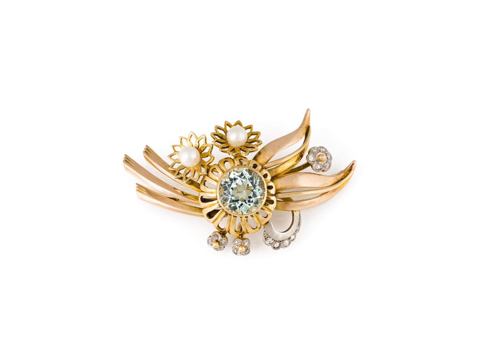 PT/GG 585. Maße: ca. 63,2 mm x 35,5 mm. Ges.-Gew.: ca. 21,4 g. Brosche im Floralen Motiv, besetzt mit einem zentralen Aquamarin von ca. 6.83 ct., sowie