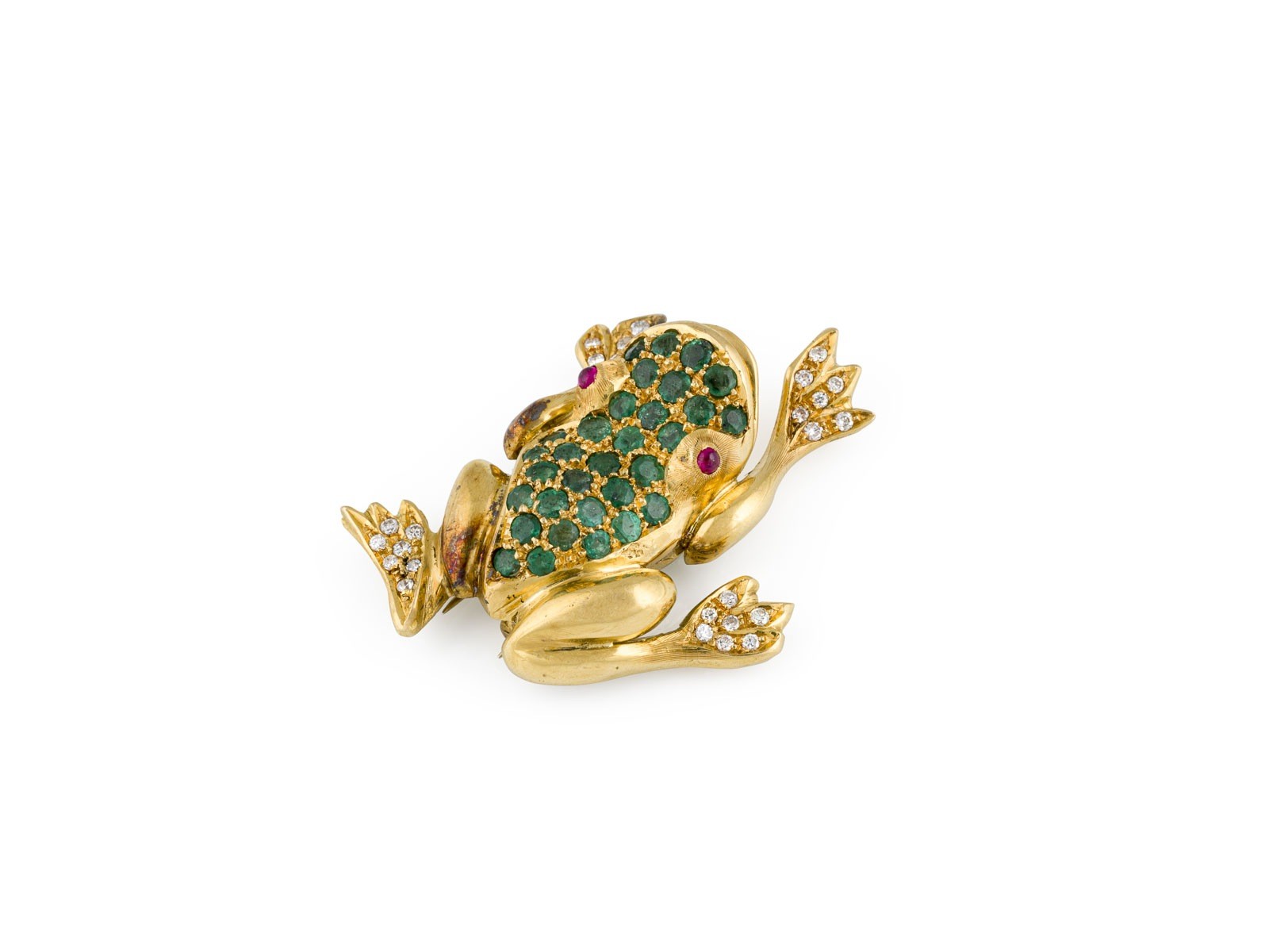 GG 750. Maße: ca. 46,0 x 35,5 mm. Ges.-Gew.: ca. 22,8 g. Große Brosche in Form eines Froschs, besetzt mit Brillanten zus. ca. 0.33 ct., Smaragden