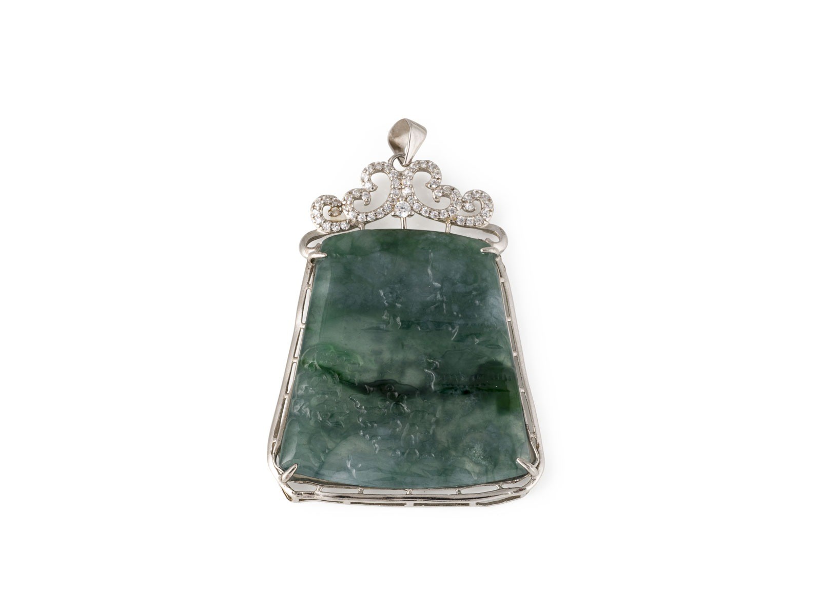 AG 925. Maße: ca. 49,6 mm x 33,4 mm. Ges.-Gew.: ca. 7,5 g. Geschnitzter Jadeit Anhänger.