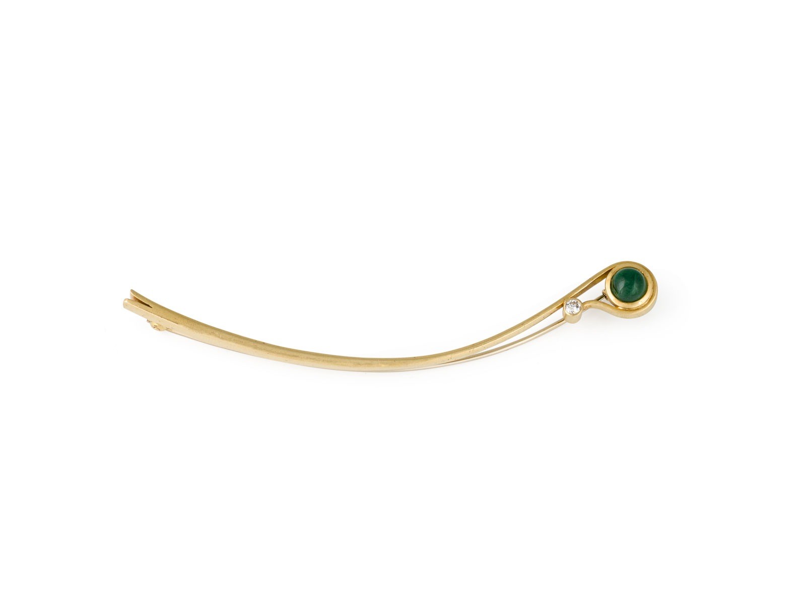 GG 750. Maße: L.: ca. 99,0 mm, B.: ca. 11,0 mm. Ges.-Gew.: ca. 13,4 g. Geschwungene Brosche, besetzt mit einem Brillanten von ca. 0.10 ct. G/VVS und einem grünen