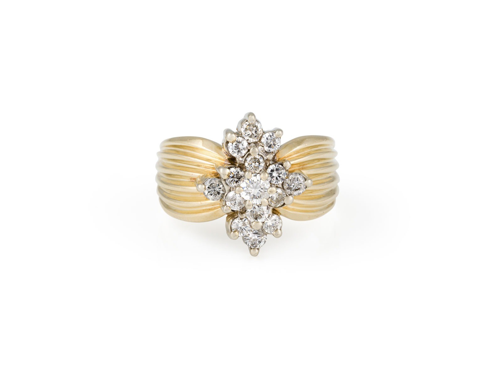 GG 585. Ringmaß: ca. 59. Ringkopfmaße: ca. 17,0 x 13,6 mm. Ges.-Gew.: ca. 8,5 g. Breiter Brillant-Clusterring, besetzt mit Brillanten zus. ca. 1.00 ct. H-K/VS-P.