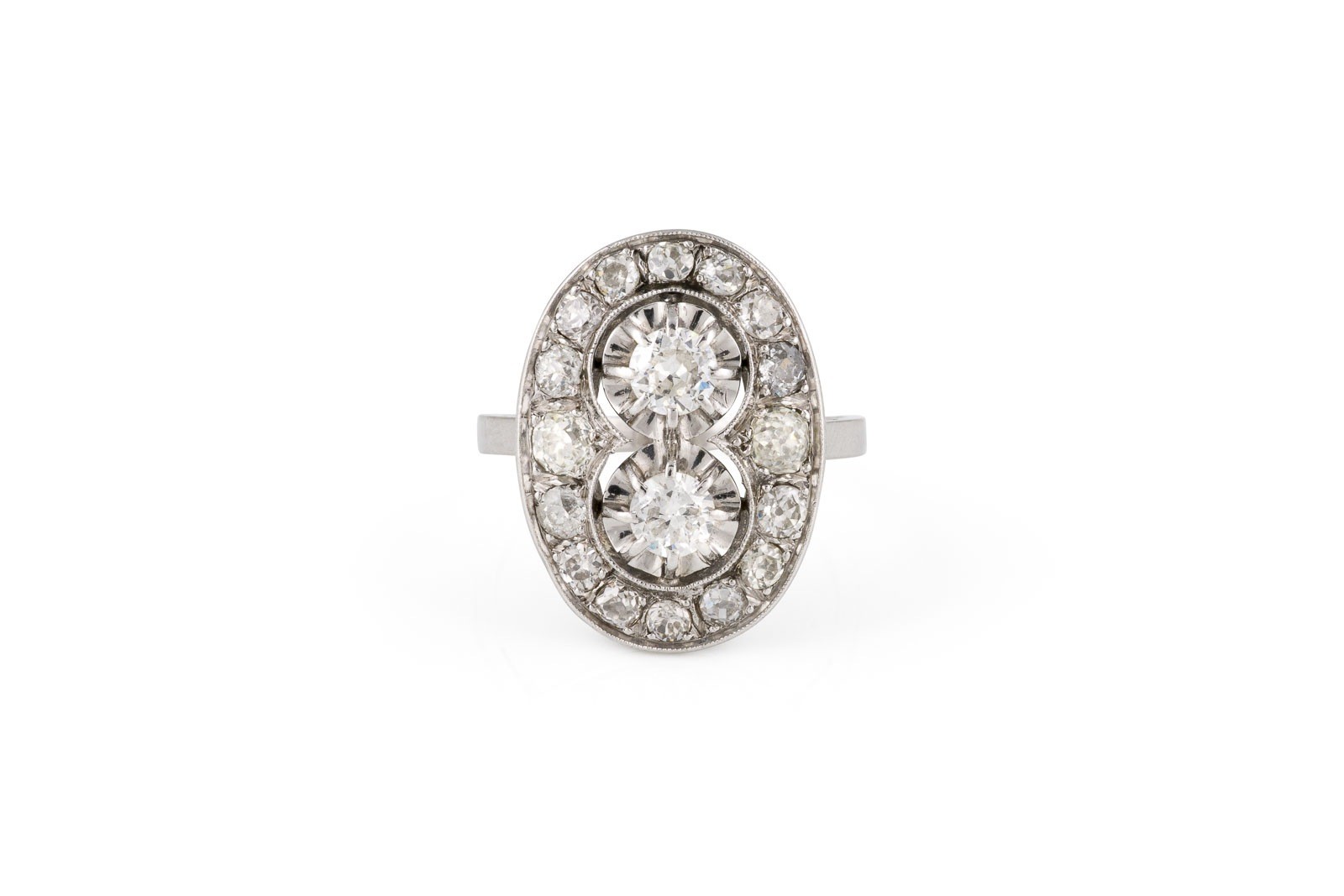 PT. Ringmaß: ca. 52. Ringkopfmaße: ca. 20,0 x 14,6 mm. Ges.-Gew.: ca. 5,4 g. Ring, üppig besetzt mit Diamanten im Brillant- und Altschliff zus. ca. 1.50 ct. G-I/VVS-P.