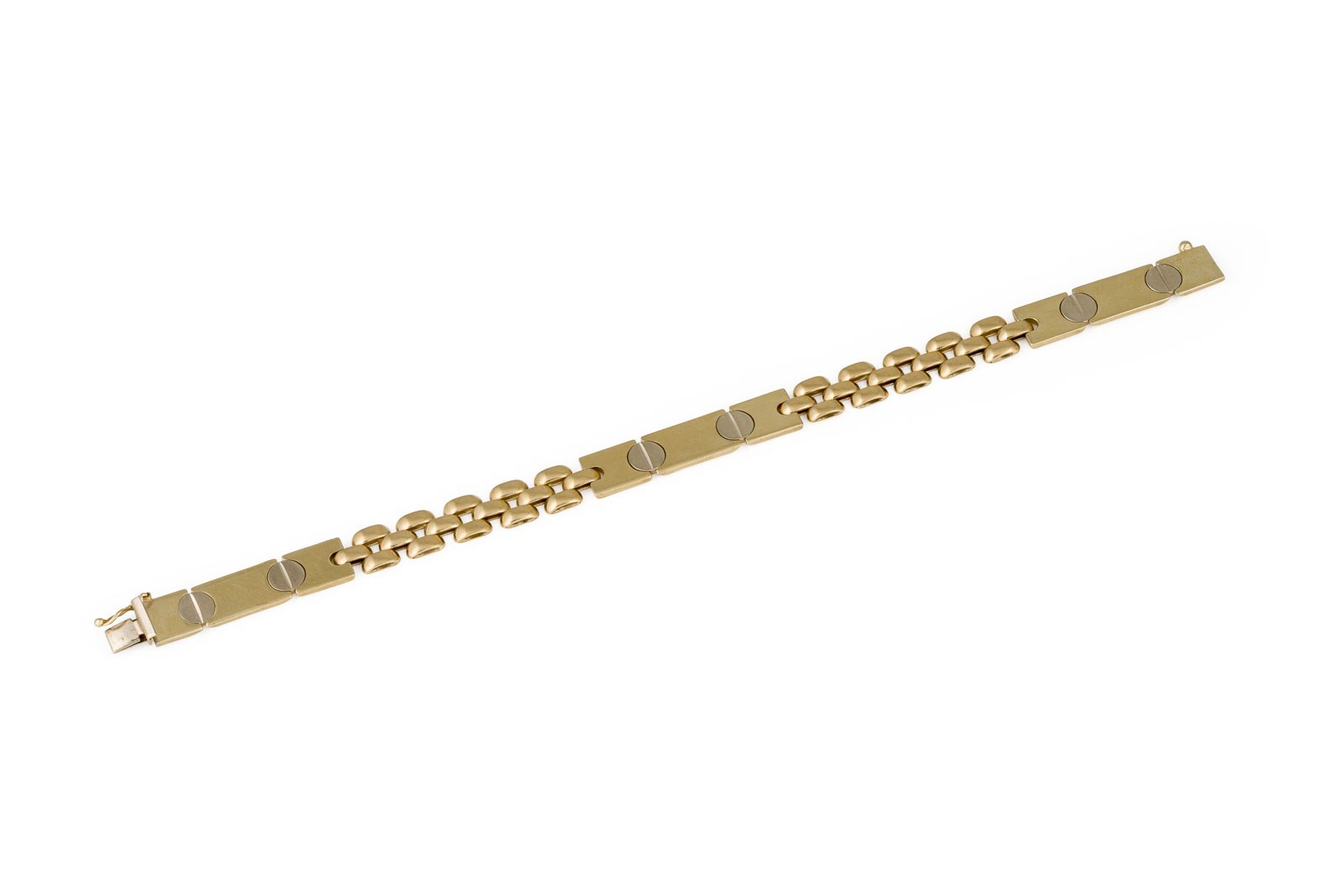 GG 585. L.: ca. 18,0 cm. B.: ca. 7,7 g. Ges.-Gew.: ca. 11,2 g. Goldarmband. Kastenschloss mit Sicherheitsacht.