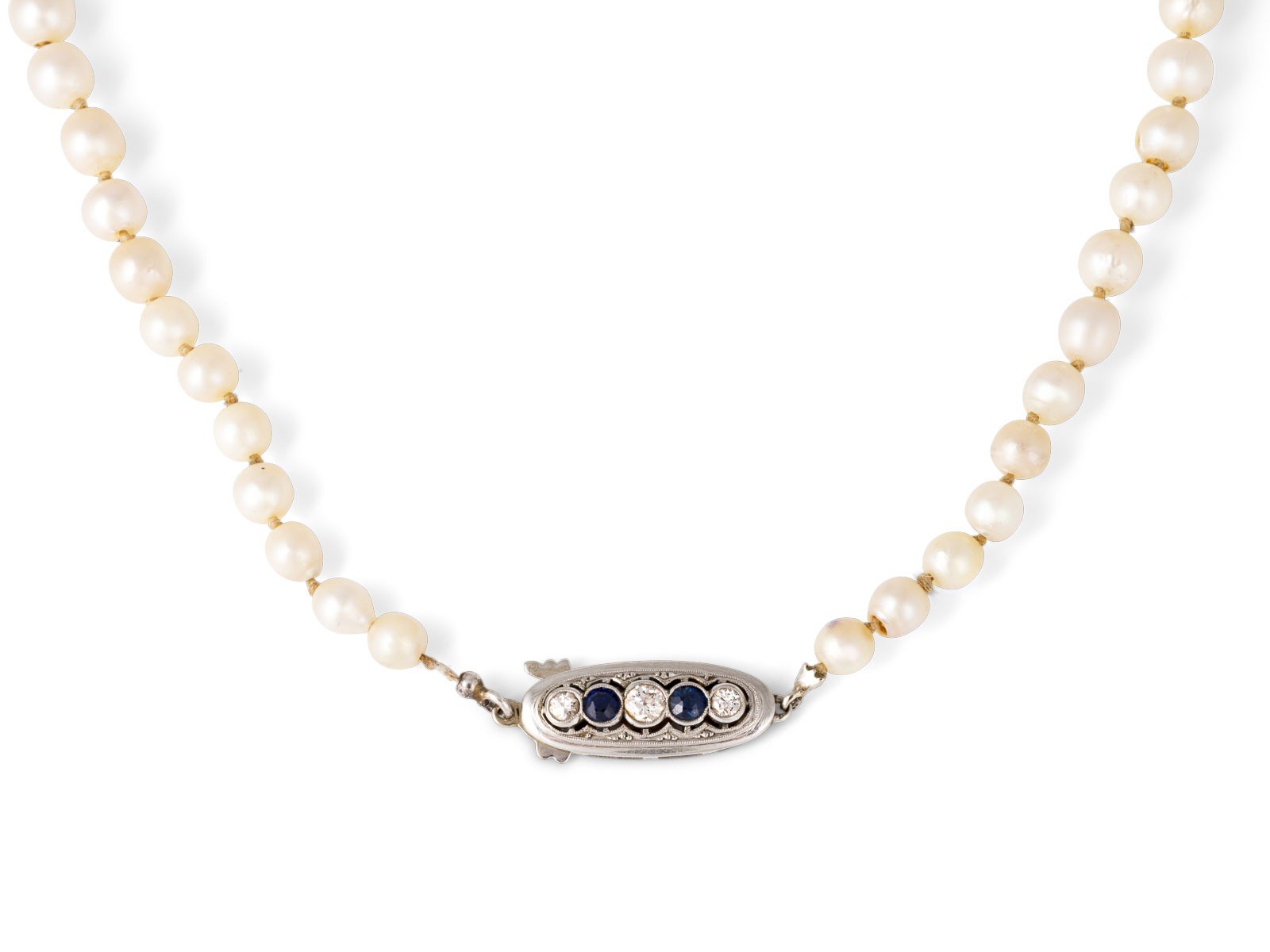 mit Art Déco Verschluss, besetzt mit 3 Diamanten zus. ca. 0.20 ct. H-I/VS und 2 blauen