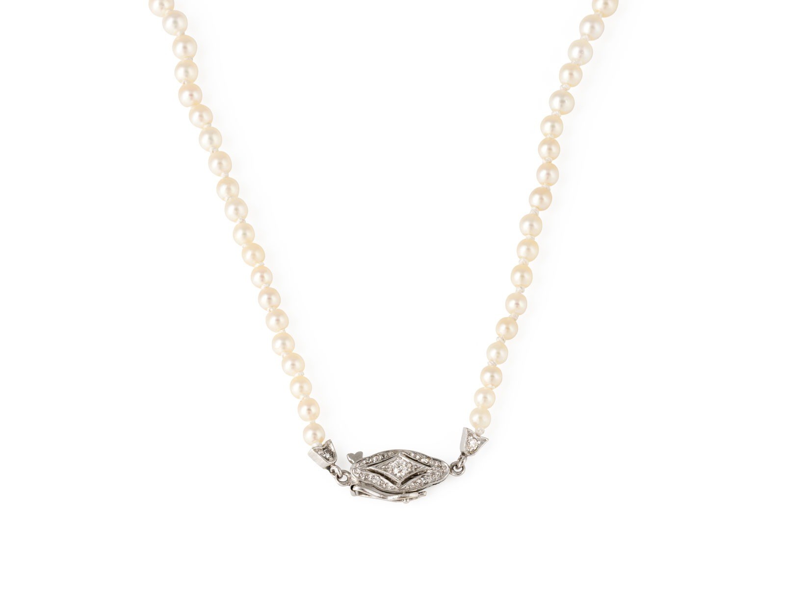 WG 585. Maße: L.: ca. 49,0 cm. Ges.-Gew.: ca. 13,5 g. Perlencollier, mit graduierten Perlen von D: ca. 3,1-7,6 mm. Steckverschluss mit