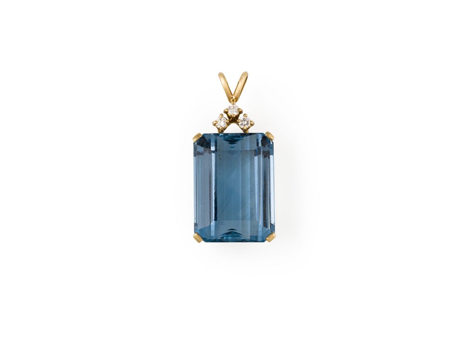 GG 585. Maße: ca. 37,4 mm x 17,8 mm. Ges.-Gew.: ca. 14,2 g. Großer Anhänger mit einem Blautopas von ca. 39.00 ct., sowie 3 Brillanten zus. ca. 0.27