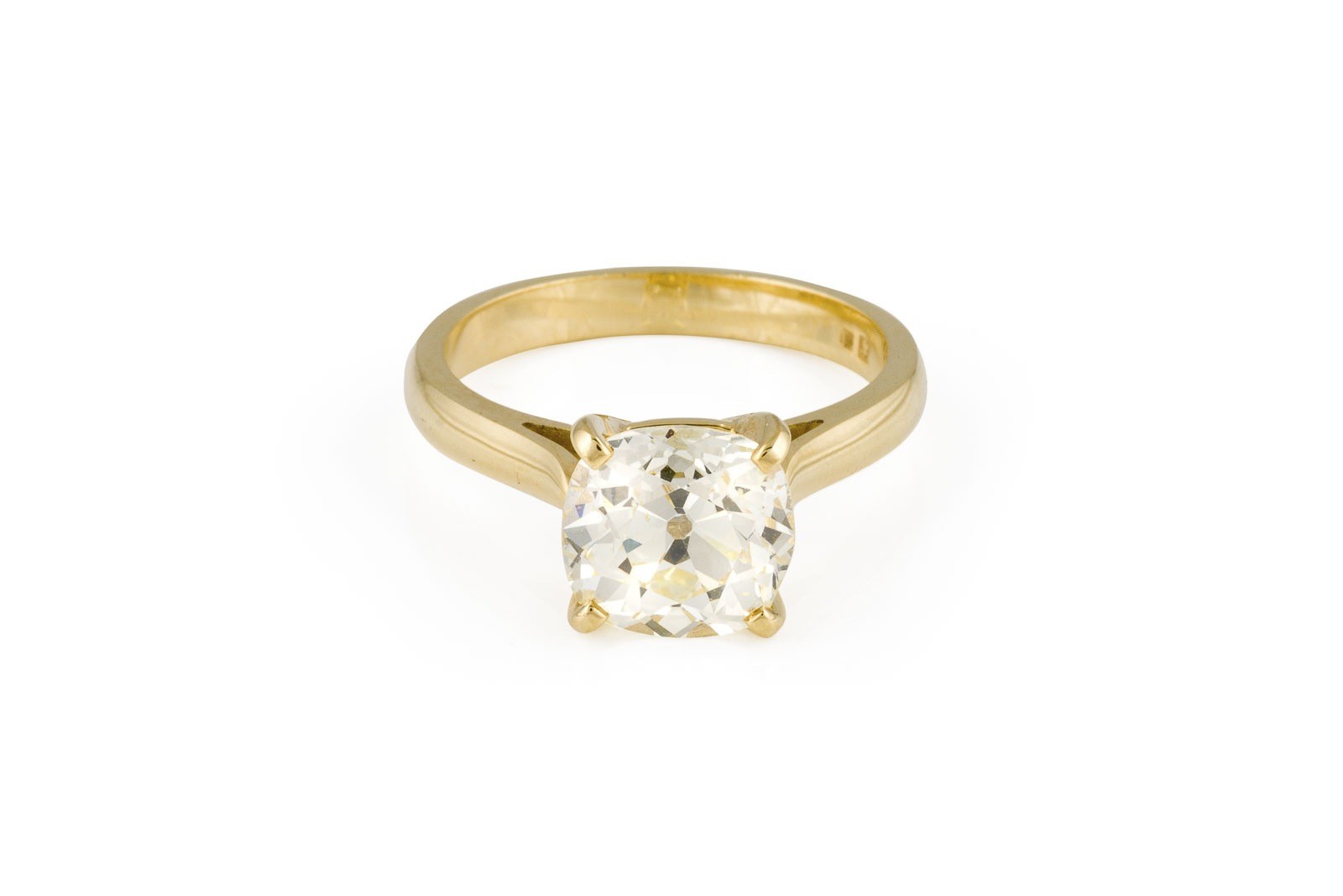 GG 750. Ringmaß: ca. 55,5. Ges.-Gew.: ca. 5,4 g. Solitärring, besetzt mit einem Diamanten im Altschliff von ca. 3.26 ct. M/SI1. 9,06 x 8,76