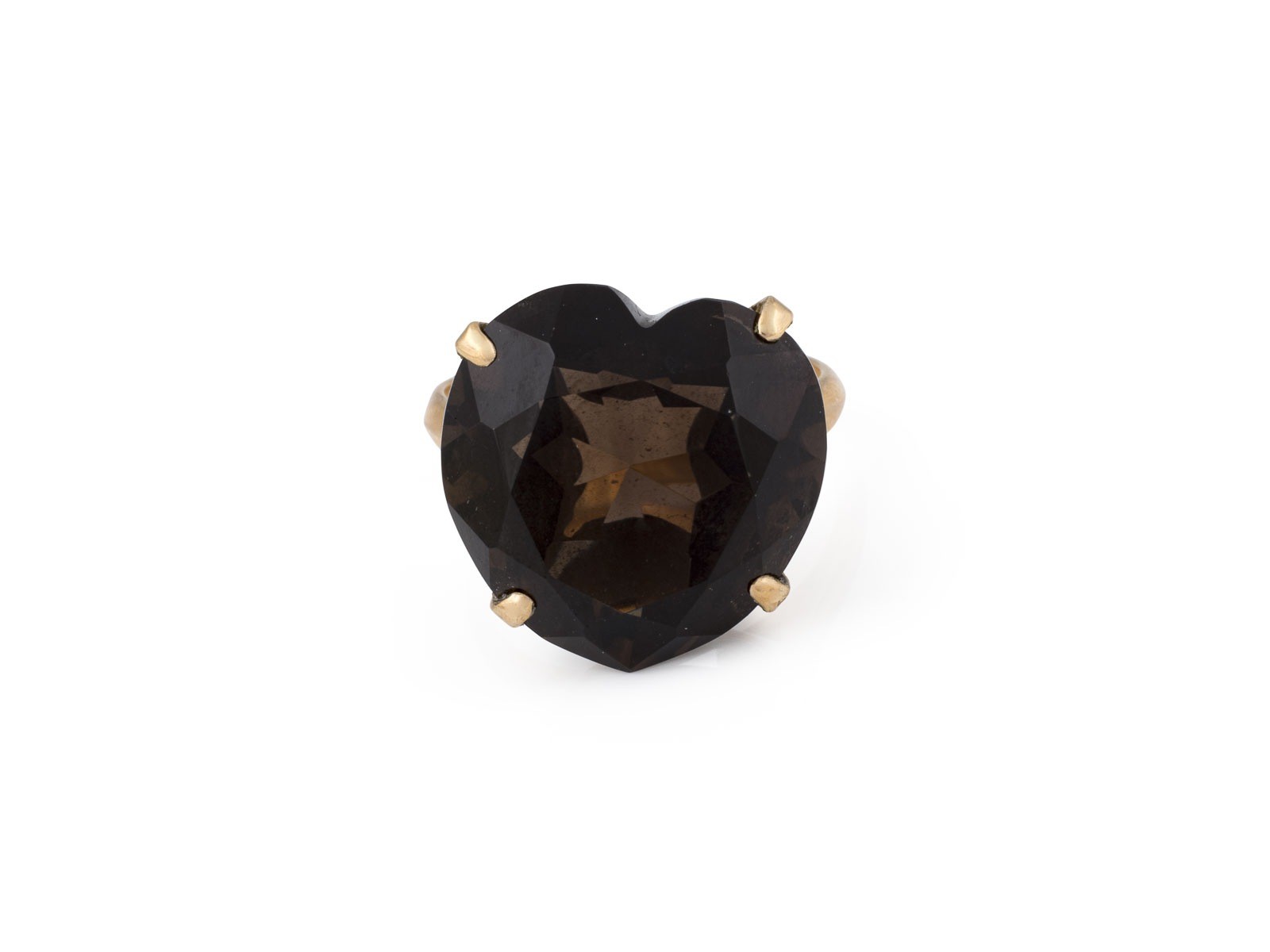 GG 750. Ringmaß: ca. 56,5. Ringkopfmaße: ca. 17,8 x 18,2 m. Ges.-Gew.: ca. 6,6 g. Ring, besetzt mit einem großen Rauchquarz in Form eines Herzens von ca. 15.12 ct.