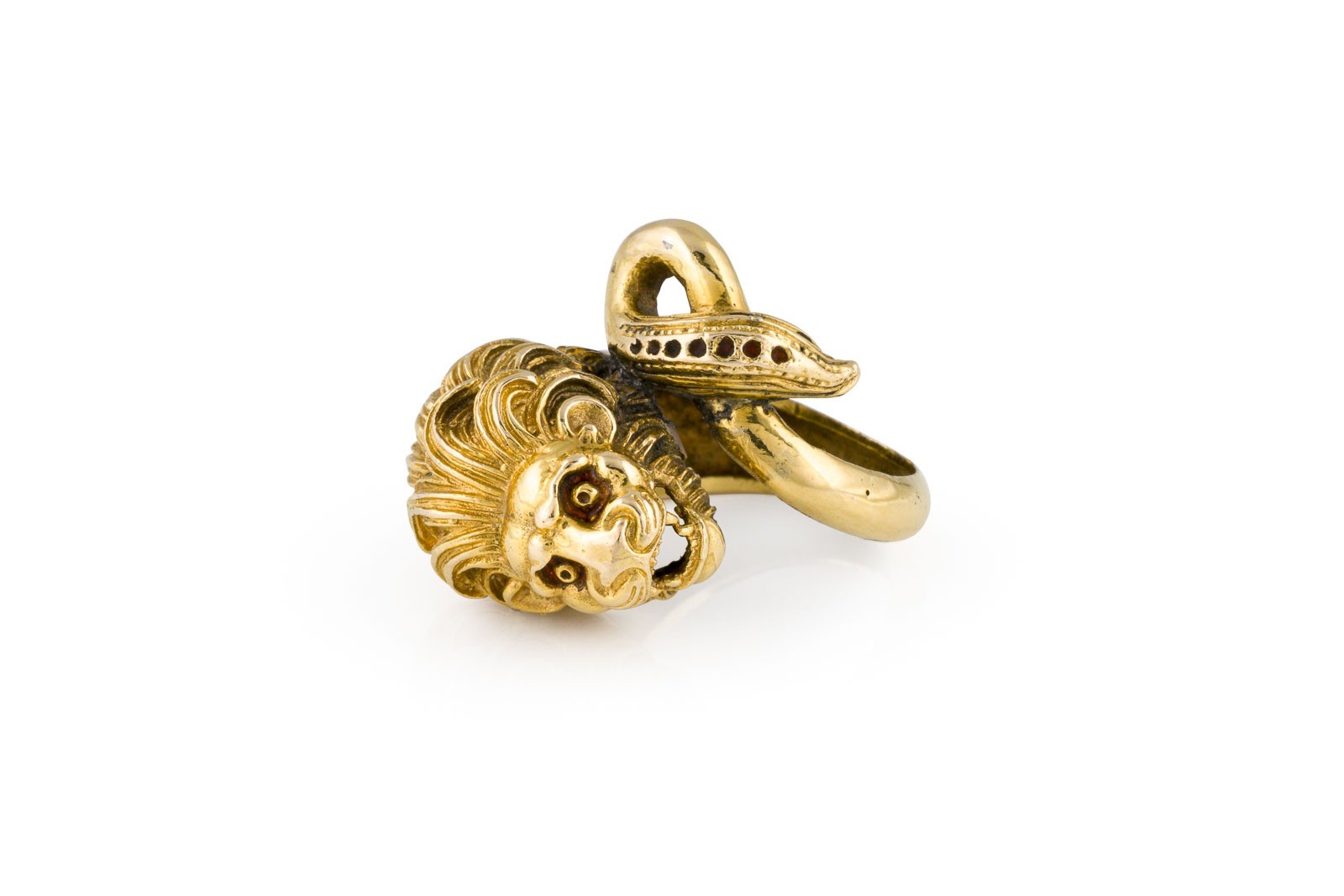 GG 750 (getestet). Ringmaß: ca. 49. Ges.-Gew.: ca. 12,9 g. Emaillierter Ring, in Form eines Löwens.