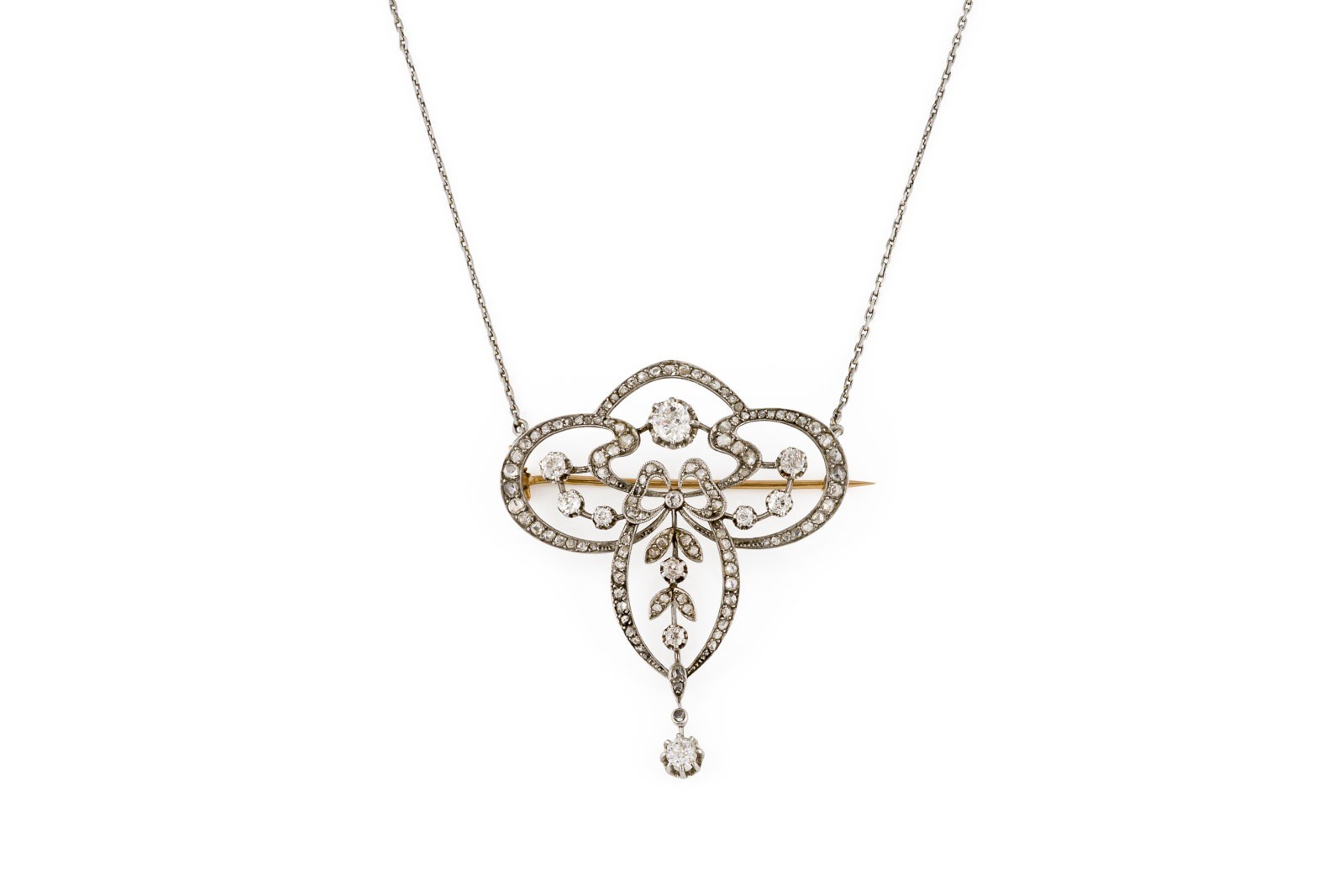 AG/PT/GG 750 (getestet). L.(Collier): ca. 43,0 cm. Ges.-Gew.: ca. 16,0 g. Brosche, welche als Collier getragen werden kann, besetzt mit Diamanten im Alt- und