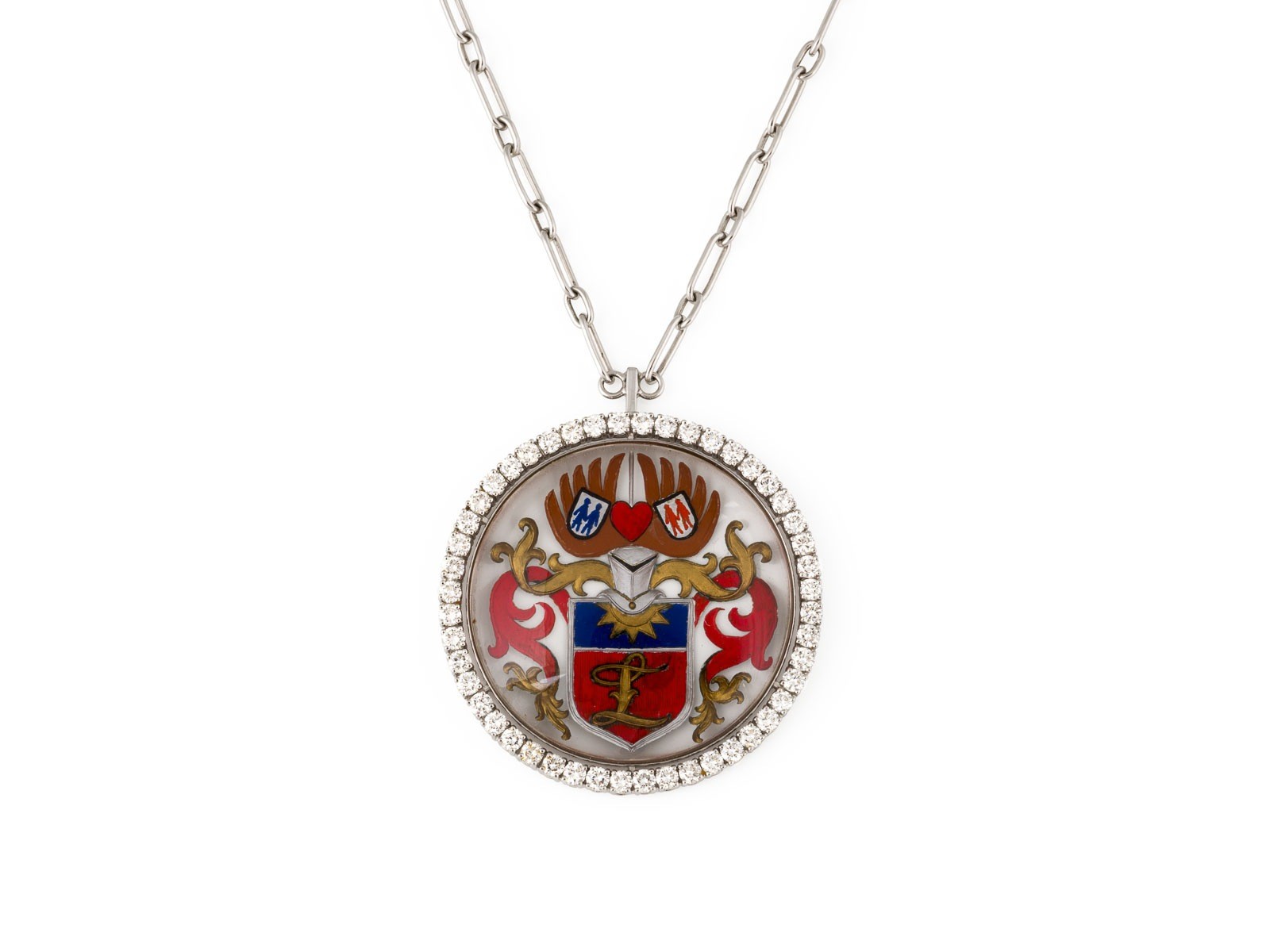 WG 750. L.: ca. 73,0 cm. Ges.-Gew.: ca. 36,9 g. Collier mit einem großen, runden Familienwappen-Anhänger, umrandet von Brillanten zus. ca.