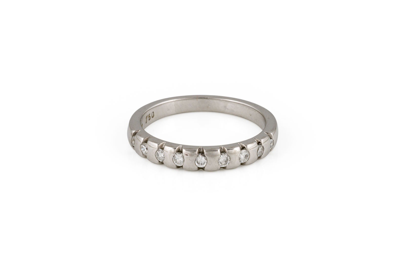 WG 750. Ringmaß: ca. 54. Ringbreite: ca. 3,4 mm. Ges.-Gew.: ca. 4,0 g. Halb-Memoirering, besetzt mit Diamanten zus. ca. 0.25 ct. Bei zwei Diamanten handelt es