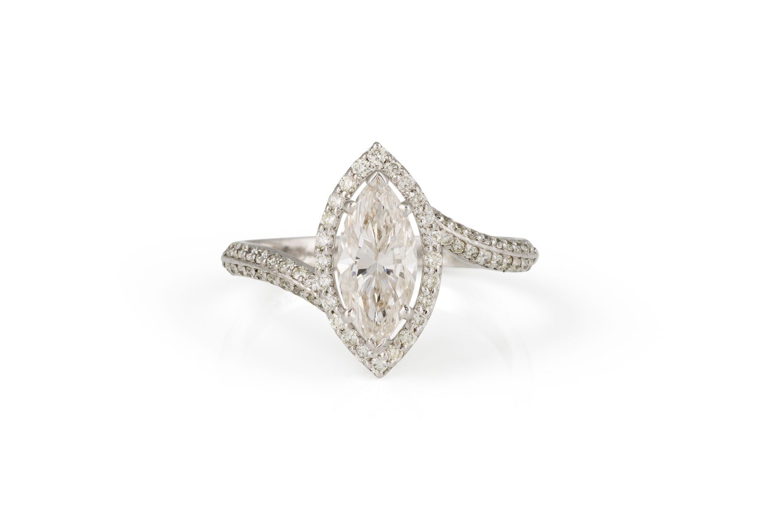 WG 750. Ringmaß: ca. 56. Ringkopfmaße: ca. 15,3 x 8,5 mm. Ges.-Gew.: ca. 3,4 g. Halo Ring, besetzt mit einem zentralen Diamanten im Navetteschliff von ca. 1.30 ct. I/VS.