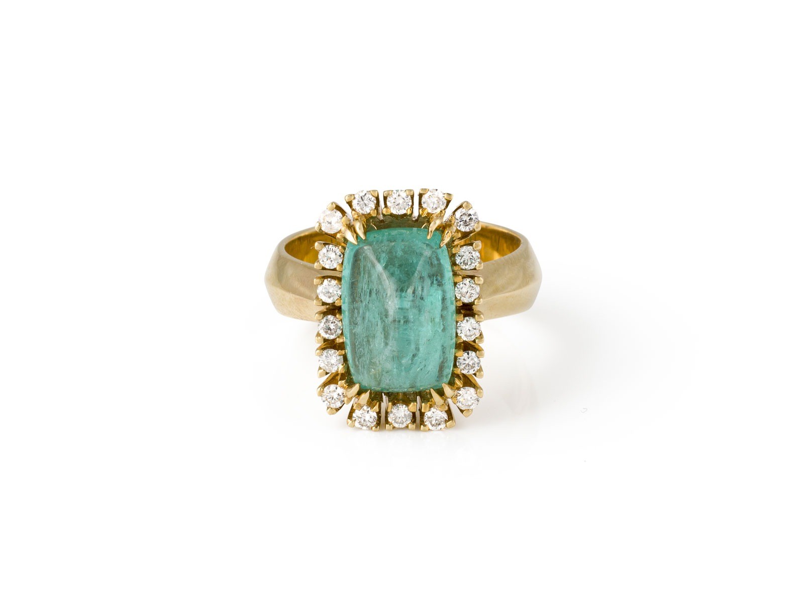 GG 585. Ringmaß: ca. 56. Ringkopfmaße: ca. 18,3 mm x 12,6. Ges.-Gew.: 9,8 g. Ring, besetzt mit einem zentralen Smaragd-Cabochon von ca. 4.00 ct., sowie ca. 18