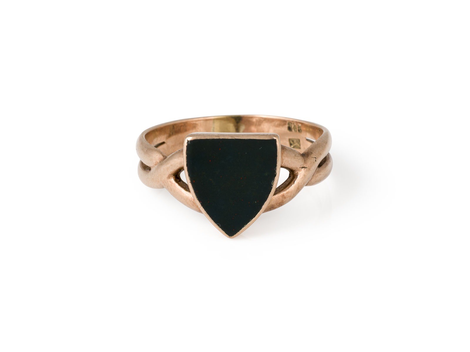RG 333. Ringmaß: ca. 63. Ges.-Gew.: ca. 3,6 g. Herren Siegelring mit einem Heliotrop, auch Blutjaspis genannt in Form eines Schildes.