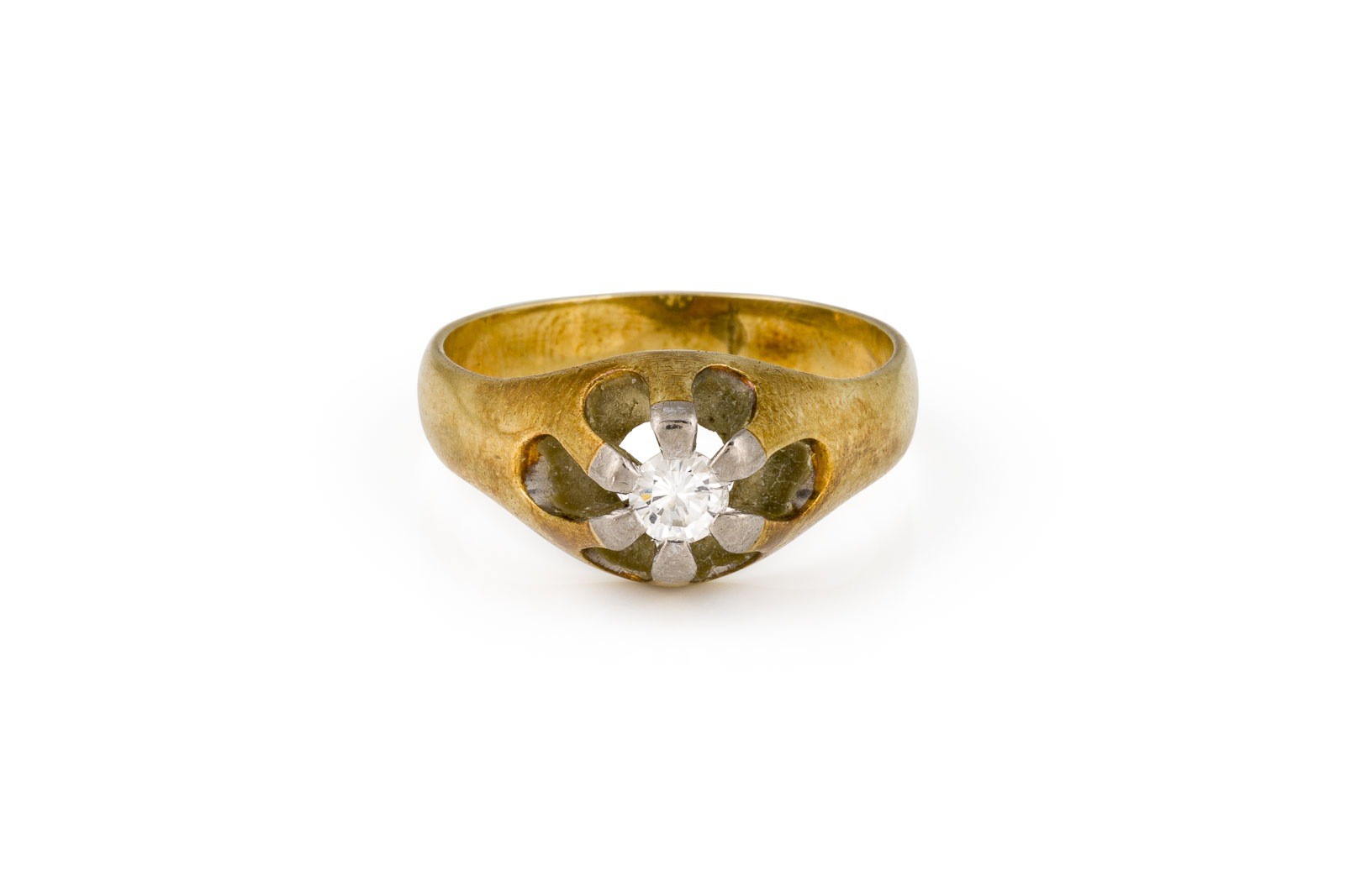 GG 585. Ringmaß: ca. 69,5. Ringbreite: ca. 11,7. Ges.-Gew.: ca. 9,2 g. Solitärring, besetzt mit einem Brillanten von ca. 0.35 ct. G/VVS.