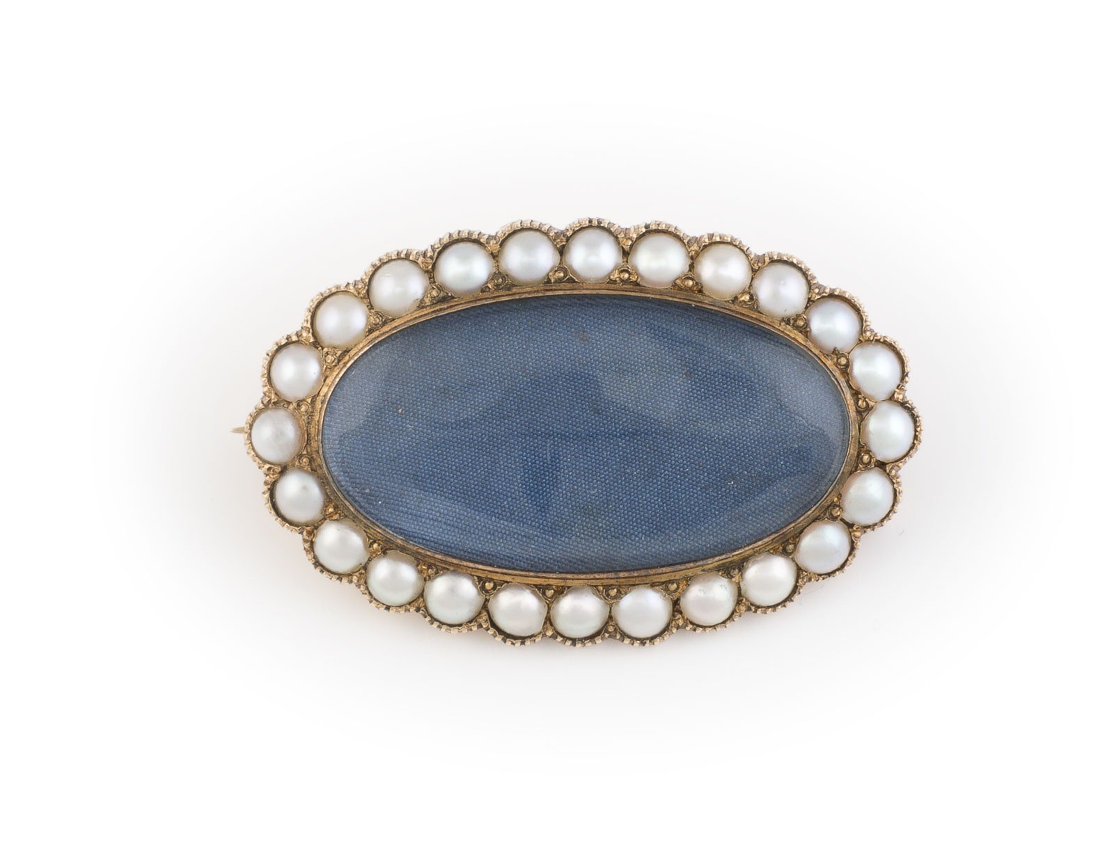 GG 585 (wohl nachträglich punziert). Maße: ca. 36,5 mm x 23,2 mm. Ges.-Gew.: ca. 9,6 g. Ovale Brosche mit umlaufendem Perlbesatz, blaue Stoffeinlage, Rückseitig monogrammiert und