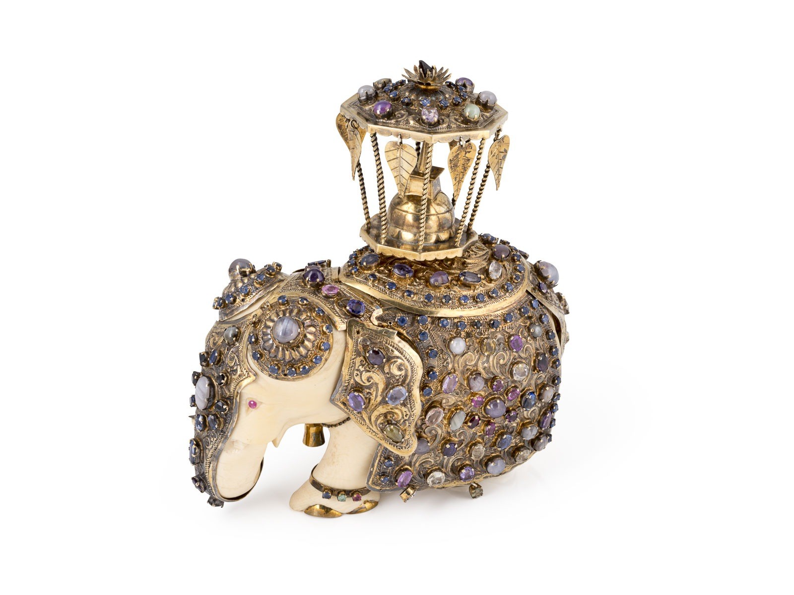 Metall, vergoldet; üppiger Besatz aus Edel- und Halbedelsteinen, Elfenbein geschnitzt. H.: ca. 13,0 cm, L.: ca 12,5 cm, T.: ca. 6,0 cm. Ges.-Gew.: ca. 500,0 g. Naturalistisch aus Elfenbein geschnitzte Figur eines schreitenden Prozessions-Elefanten
