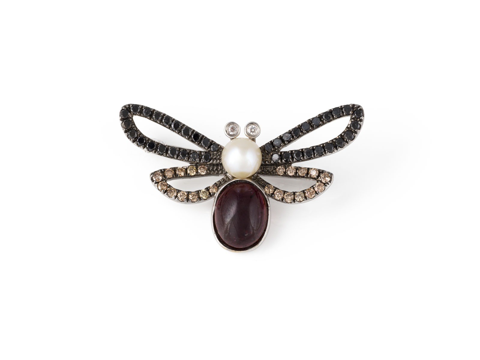 WG 750. Maße: ca. 36,0 mm x 21,2 mm. Ges.-Gew.: ca. 6,3 g. Brosche in Form eines Insekts, besetzt mit einer Perle, D.(Perle): ca. 6,0 mm, sowie